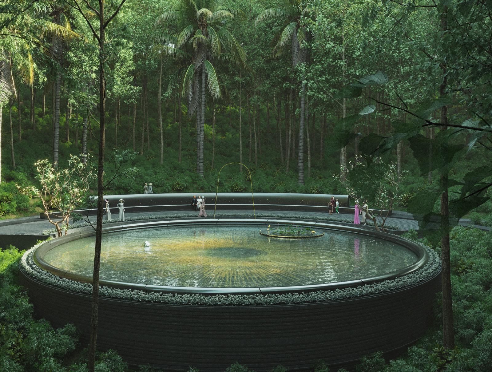 Đặc biệt, hồ nước tròn trung tâm được lấy ý tưởng từ những hình ảnh mang đậm văn hoá Á Đông, ví như tấm gương phản chiếu cả bầu trời Nam Đàn và biểu tượng cho sự giao thoa giữa lịch sử, hiện tại và tương lai. Sự luân chuyển dòng nước qua 9 tầng bậc mang những ý niệm kín đáo, “ước lệ” cho sự vĩnh hằng và thể hiện tấm lòng tưởng niệm sâu sắc của các du khách ghé thăm khu vực mộ bà Hoàng Thị Loan.