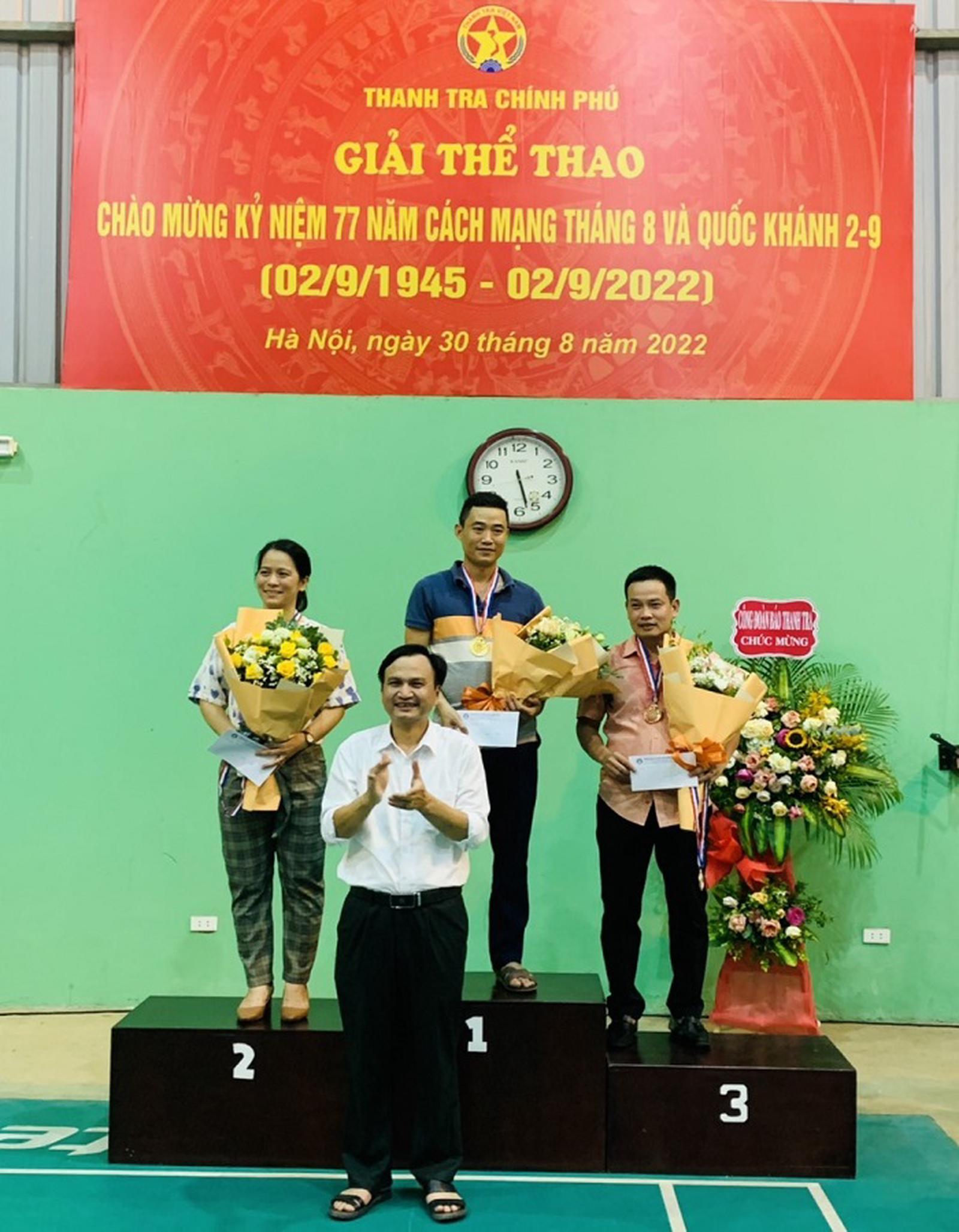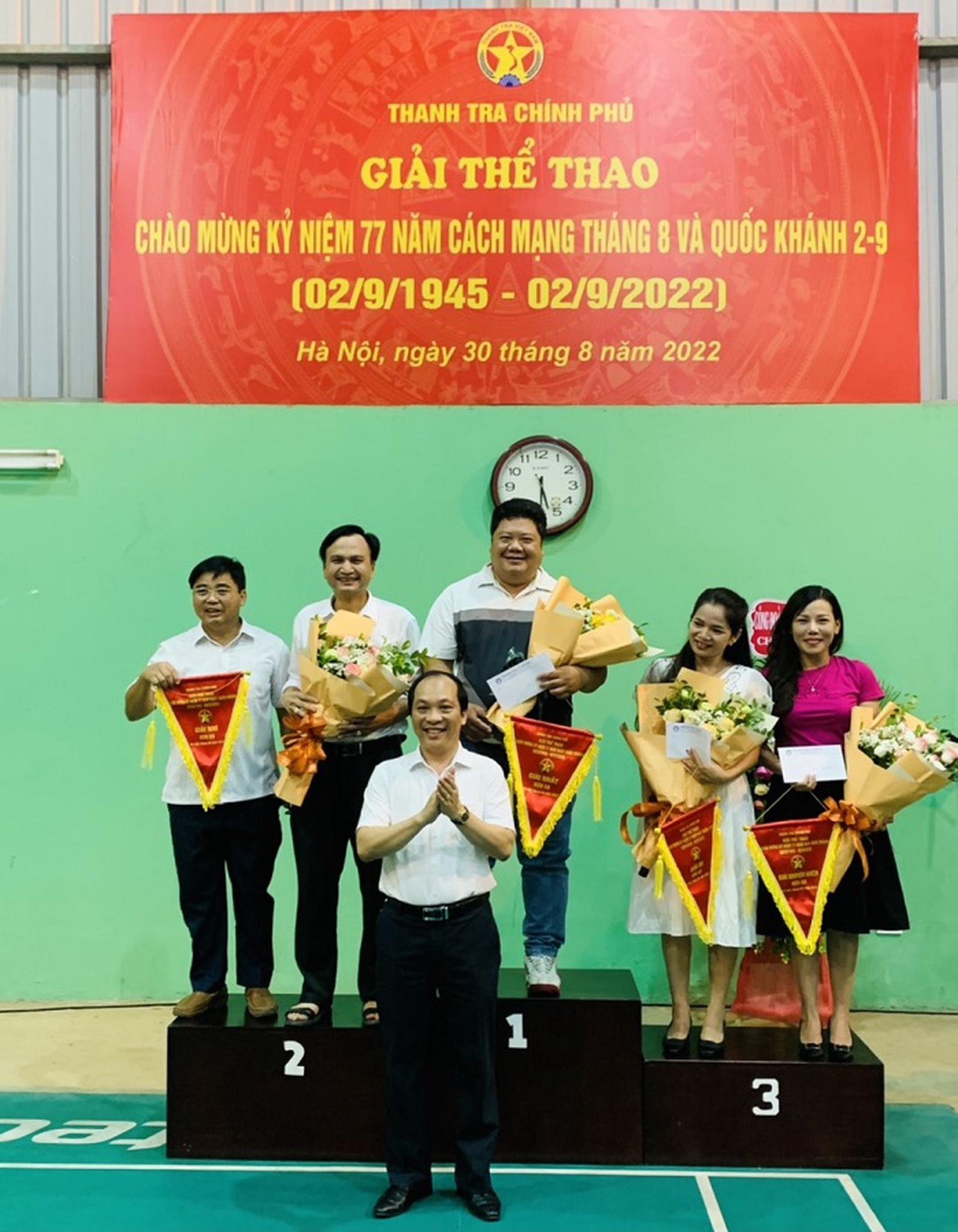 Phó Tổng Thanh tra Chính phủ Lê Sỹ Bảy tặng hoa và chúc mừng các VĐV tham gia giải. Ảnh: TQ
