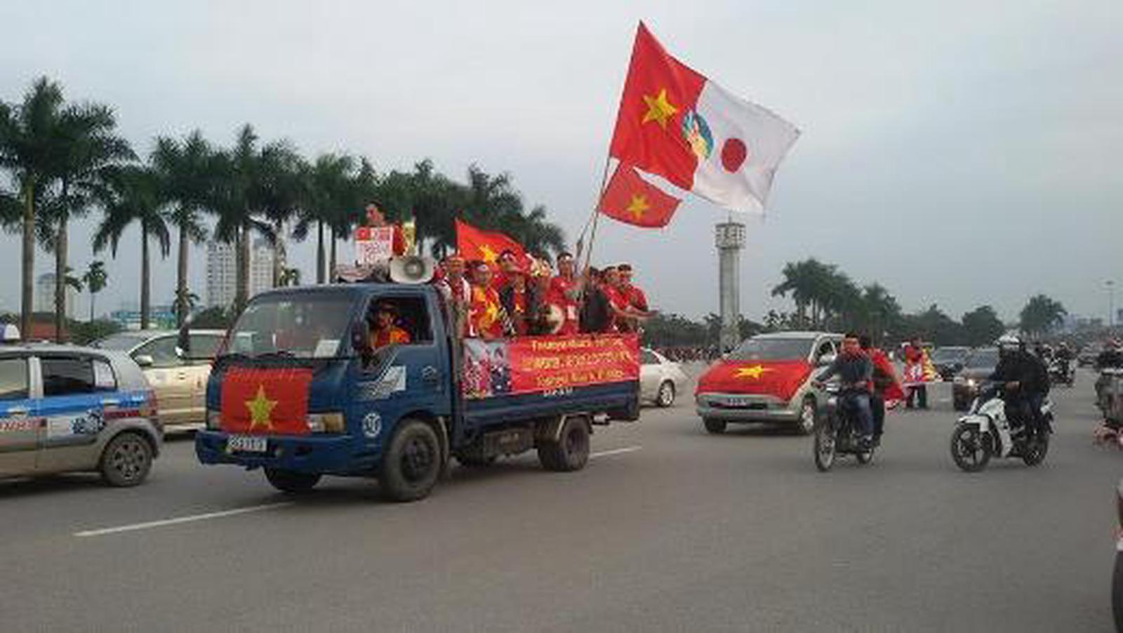 Ngay từ 3 giờ chiều nay, 11/12, những con đường chính dẫn tới SVĐ Mỹ Đình đã xuất hiện những cờ, khẩu hiệu, băng rôn nhuộm màu của cờ đỏ sao vàng.