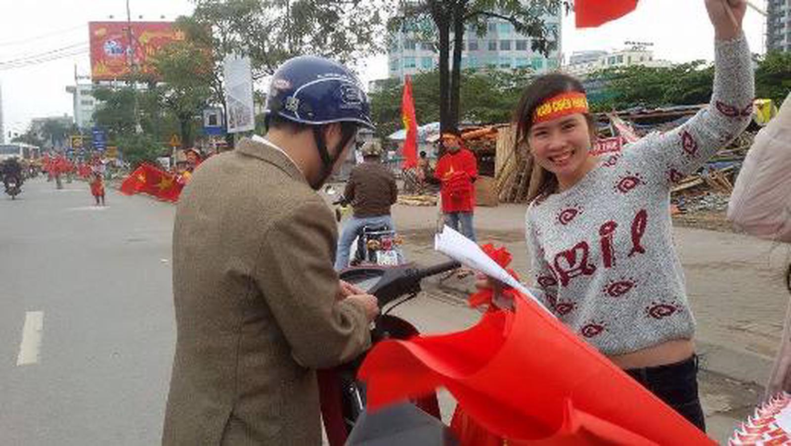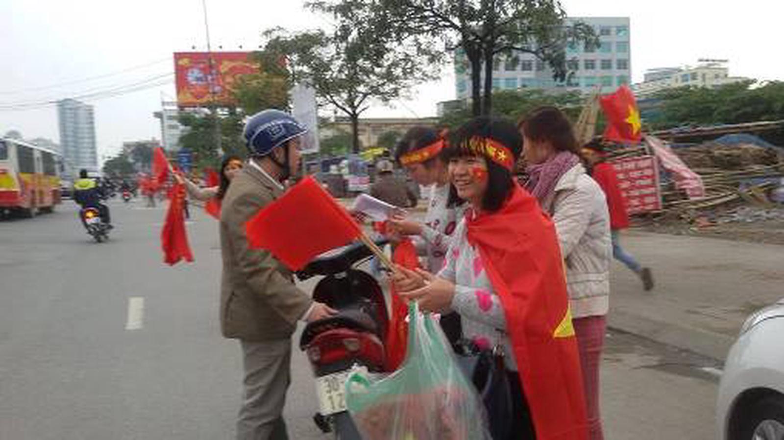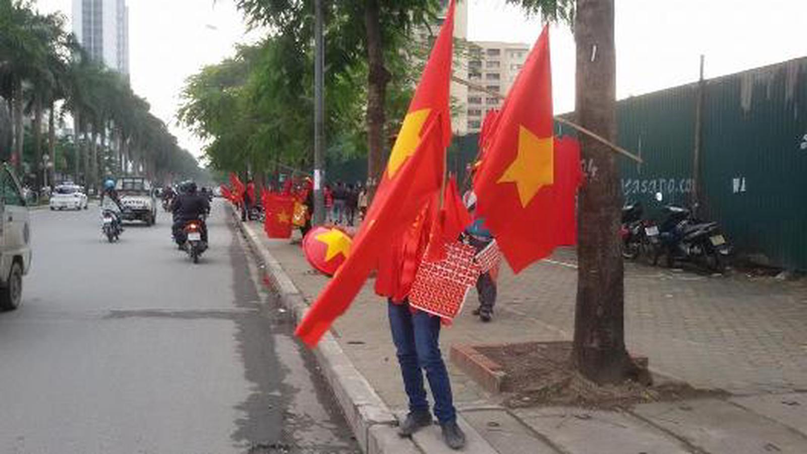 Từ trước cửa Đại học Giao thông Vận tải, cho tới dọc đường Cầu Giấy - Xuân Thủy - Mai Dịch (khu vực Đại học Thương mại) người đi đường ai ai cũng chú ý bởi cờ đỏ, sao vàng, băng rôn, khẩu hiệu được bán ngay dọc đường, trên vỉa hè.