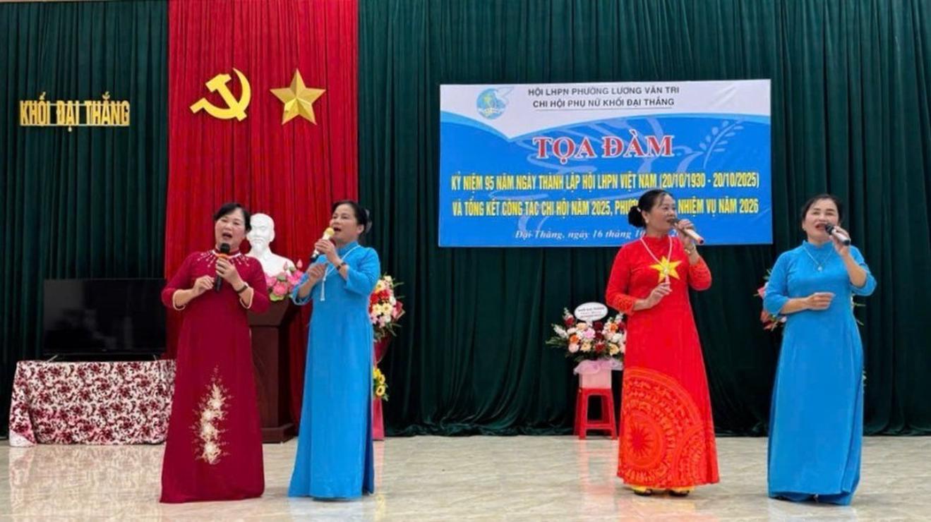 Thành viên Đội văn nghệ quần chúng khối Đại Thắng, phường Lương Văn Tri biểu diễn văn nghệ trong chương trình toạ đàm ngày thành lập Hội Liên hiệp Phụ nữ Việt Nam (20/10). Ảnh: Tuyết Mai
