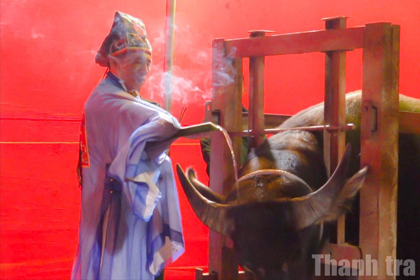 Thầy Mo thực hiện nghi lễ mổ trâu đen. Ảnh: Bùi Bình