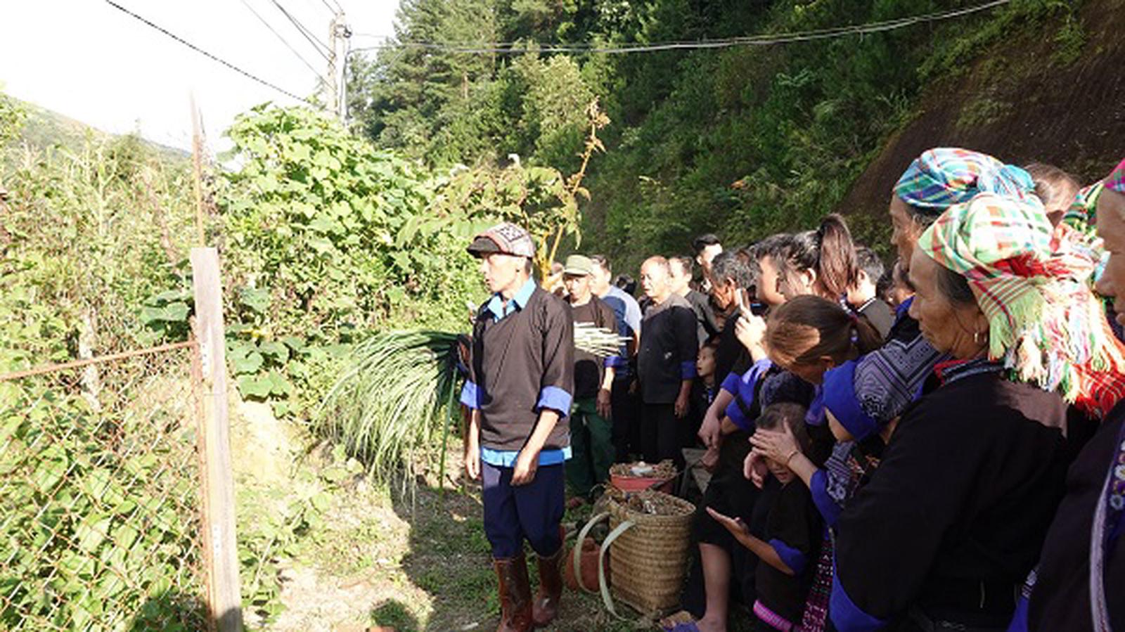 Các chủ hộ trong dòng họ buộc chung bó lâu vào cây đơn châu chấu. Ảnh: A Lù