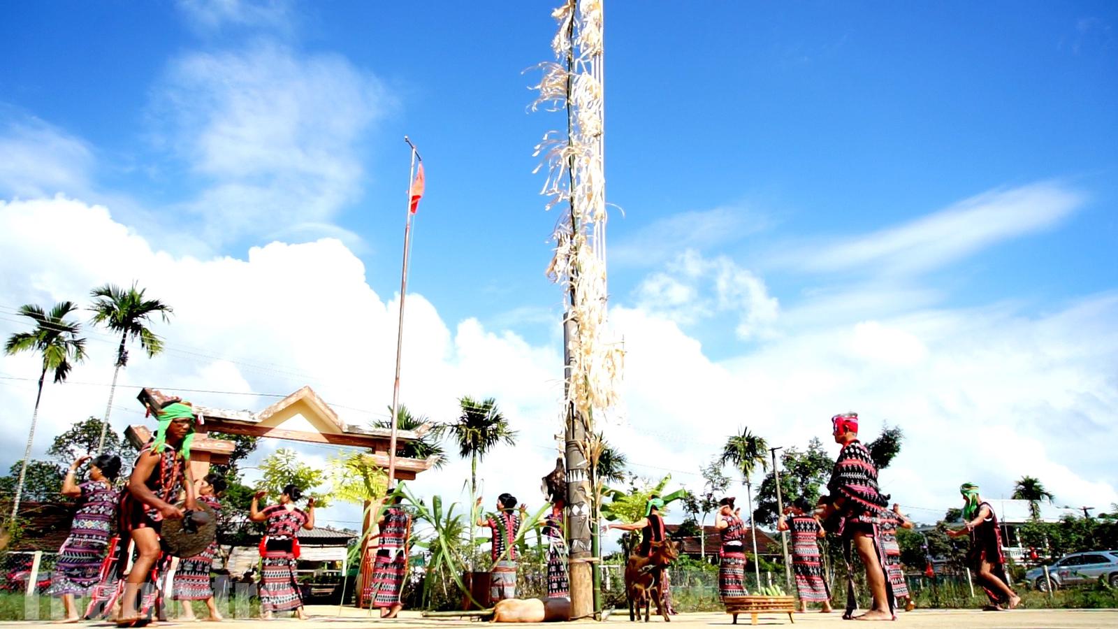 Xung quanh cột lễ, đã được chuốt và trang trí bằng những dải tre chuốt xoăn như bông hoa tượng trưng cho vòng mặt trời, vòng cuộc đời và vòng các Yang chuyển động quanh con người. Đó cũng là điều báo hiệu lễ vật đã chuẩn bị trọn vẹn, buổi lễ đã được mở cửa đón thần linh, người làng bắt đầu múa và đi vòng quanh.