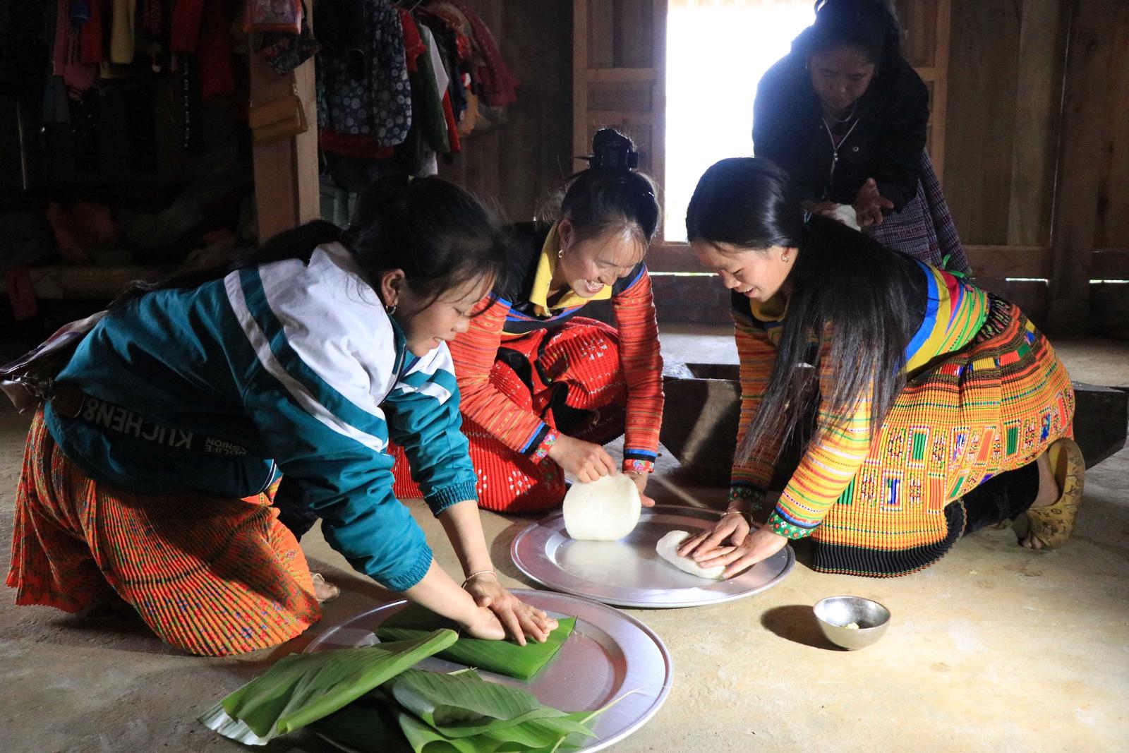 Với gia đình anh Hạng A Anh nói riêng cũng như đồng bào người Mông nói chung, trong mâm cỗ ngày Tết, bánh dày là món không thể thiếu. Đồng bào dân tộc Mông quan niệm, bánh dày tròn tượng trưng cho mặt trăng và mặt trời - là nguồn gốc sinh ra con người, vạn vật trên mặt đất. Gạo nếp nương ngâm và đồ thành xôi, rồi đổ vào một máng gỗ. Các chàng trai sức vóc khỏe mạnh dùng chày thay nhau giã đến khi thật nhuyễn và mịn, rồi gói lại bằng lá chuối. 6 cặp bánh đầu tiên gồm 12 chiếc tượng trưng cho 12 tháng trong một năm được dâng lên trời đất và vị thần mùa màng.