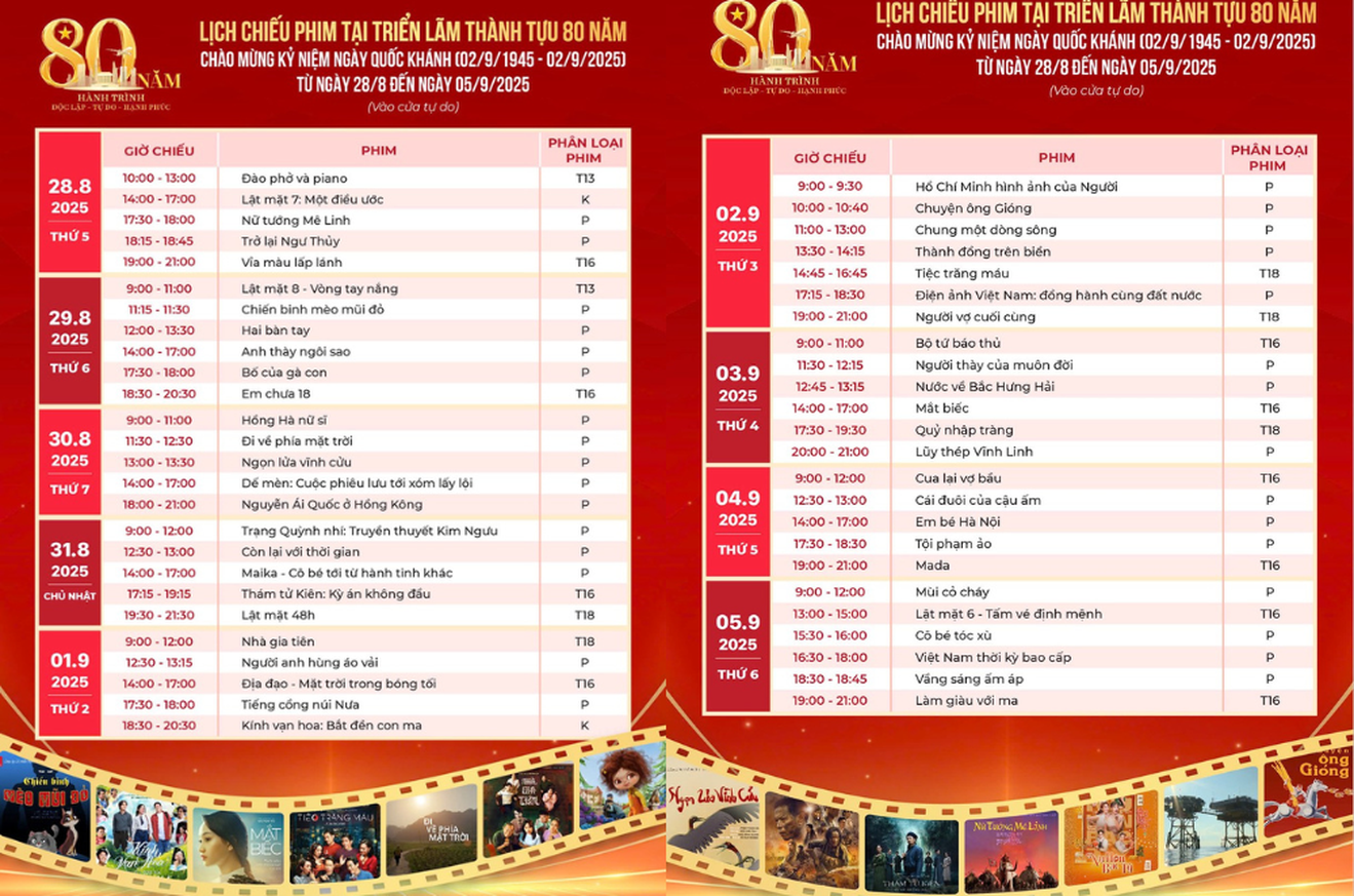 (Thanh tra) - Nhân kỷ niệm 80 năm Cách mạng Tháng Tám và Quốc khánh 2/9, một chương trình chiếu phim đặc biệt sẽ diễn ra từ ngày 28/8 đến 5/9 tại Trung tâm Hội chợ Triển lãm Quốc gia (Đông Anh, Hà Nội). Khán giả sẽ có cơ hội thưởng thức miễn phí 50 tác phẩm điện ảnh đặc sắc của Việt Nam và gặp gỡ, giao lưu trực tiếp với nhiều nghệ sĩ, diễn viên nổi tiếng.