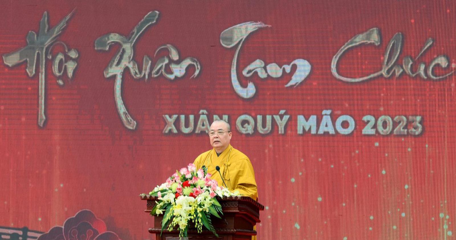 Hòa thượng Thích Thanh Nhiễu phát biểu diễn văn khai hội Xuân Tam Chúc. Ảnh: TV