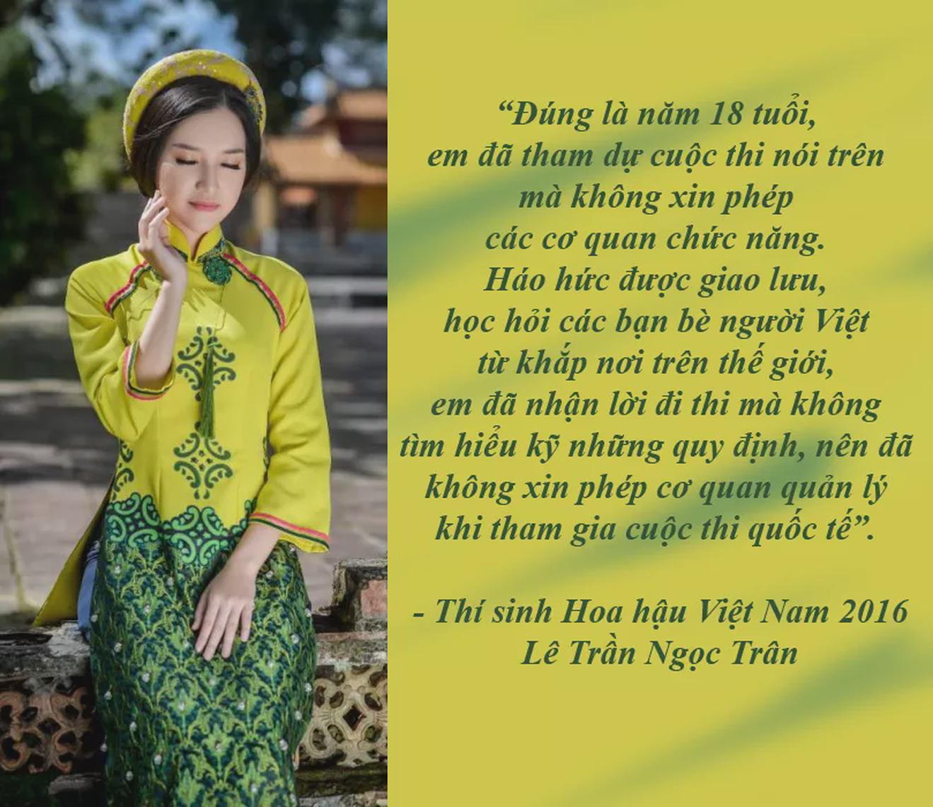 Sự thực việc thí sinh Nguyễn Thị Thành bị rút khỏi Hoa hậu Việt Nam - Chiều 10/8, BTC Hoa hậu Việt Nam 2016 đã có thông tin phản hồi xoay quanh những vấn đề thắc mắc của phóng viên về lý do “ép” thí sinh Nguyễn Thị Thành phải rời khỏi Hoa hậu Việt Nam 2016. Ngoài vấn đề liên quan đến người đẹp Bắc Ninh, BTC cũng thông tin thêm về những thí sinh khác có can thiệp thẩm mỹ. Nguyễn Thị Thành xin rút khỏi Hoa hậu Việt Nam vì bị phát hiện bọc răng? - Thông tin về việc thí sinh Nguyễn Thị Thành (Bắc Ninh) nộp đơn xin rút khỏi Hoa hậu Việt Nam 2016 đã gây xôn xao trên mạng xã hội bởi cô gái trẻ được cho là “bản sao Phạm Hương” vốn được đánh giá như một ứng viên sáng giá. Thí sinh bị tố thi “chui” tại Nhật đã tham gia cuộc thi như thế nào? - Ngày 10/8, theo nguồn tin của Dân trí, ông Trần Thiện Khánh (nhà thiết kế Khánh Shyna tại Huế) cho biết đã từng tài trợ cho Lê Trần Ngọc Trân tham gia cuộc thi Kim Mộc Thủy Hỏa Thổ (Hoa hậu Thế giới Việt Nam tại Nhật 2014). BTC Hoa hậu Việt Nam sẽ xử lý thí sinh Ngọc Trân bị “tố” thi chui - Ông Lê Xuân Sơn, trưởng BTC Hoa hậu Việt Nam 2016, cho biết BTC đã biết việc thí sinh Lê Trần Ngọc Trân bị “tố” từng tham gia thi chui tại cuộc thi Kim Mộc Thủy Hỏa Thổ (Hoa hậu Thế giới Việt Nam tại Nhật 2014). BTC đã tiến hành điều tra để xử lý vụ việc này. Thư của thí sinh Ngọc Trân gửi BTC cuộc thi Hoa hậu Việt Nam 2016 - Bằng lá thư này, thí sinh Lê Trần Ngọc Trân xin phép Ban tổ chức HHVN cho em được dừng thi, rút khỏi vòng chung kết. Sự thật việc lộ câu hỏi ứng xử Chung kết Hoa hậu Bản sắc Việt - Cách một tiếng trước khi vòng thi ứng xử của top 5 Chung kết Hoa hậu Bản sắc Việt diễn ra, trên trang cá nhân của một cư dân mạng tên Donald Nguyễn đã liệt kê một số câu hỏi mà các thí sinh trong top 5 có thể sẽ bốc phải. Theo Bích Ngọc/Dân trí