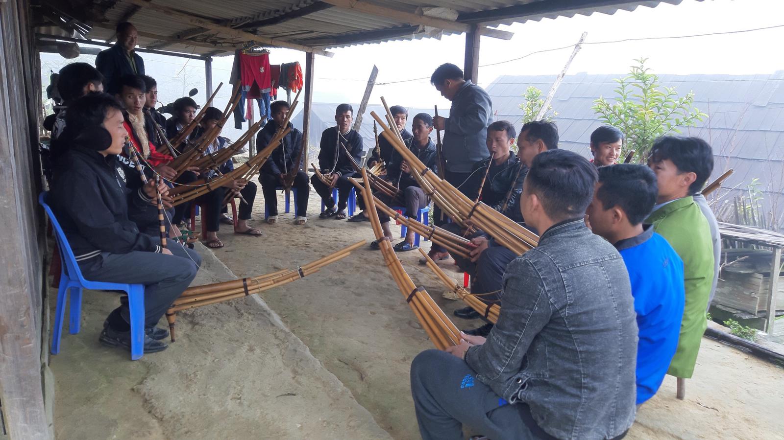 Một buổi luyện tập của nghệ nhân khèn cho những người đam mê nhạc cụ đồng bào ở bản Huồi Cọ, xã Nhôn Mai. Ảnh: Xuân Thống