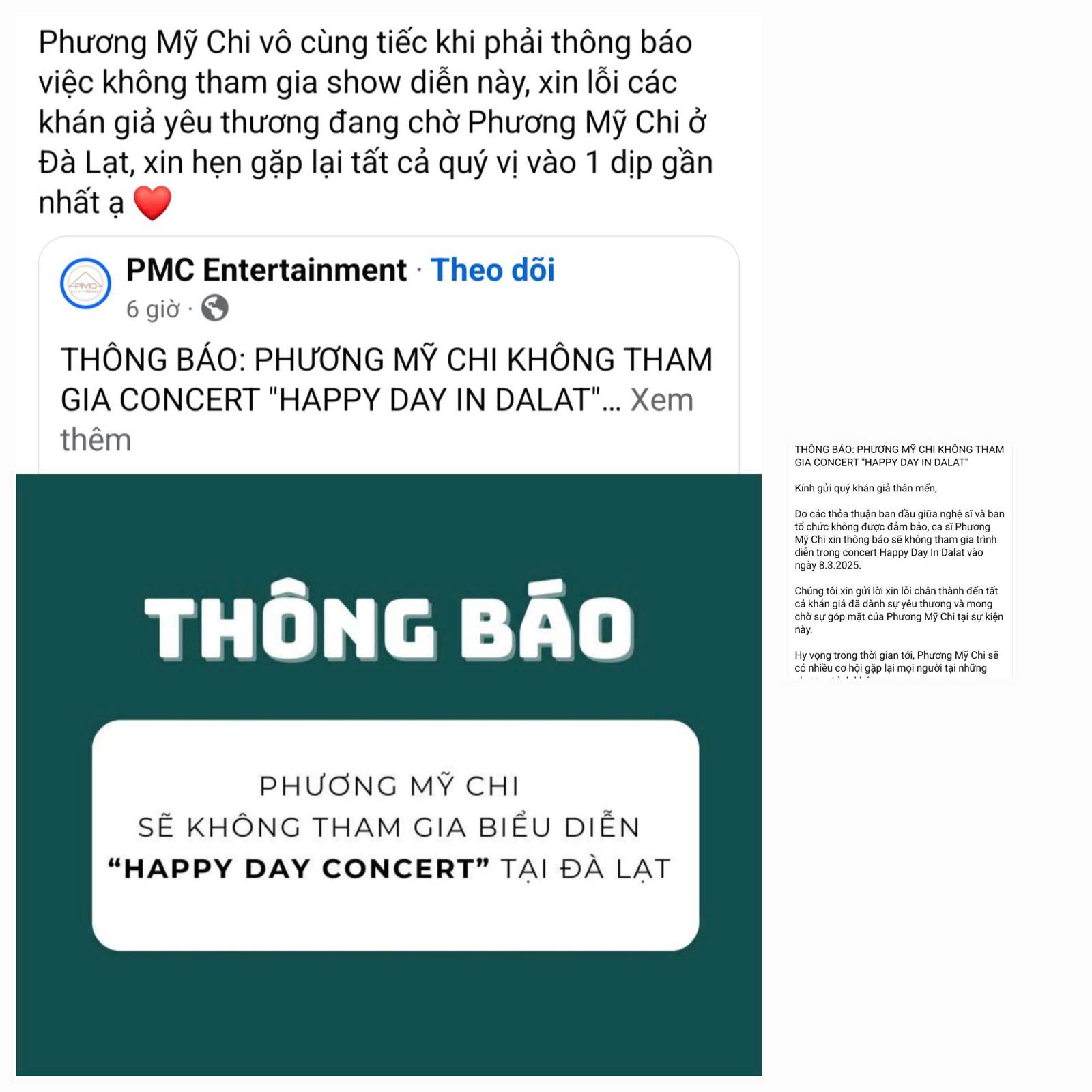 Tuy nhiên, chiều 7/3 trên fanpage của một số nghệ sĩ (có gắn tick xanh) tham gia biểu diễn tại chương trình này đã đồng loạt đăng đàn thông báo về việc không tham gia show diễn “Happy Day In Dalat” tại Đà Lạt như Minh Hằng, Phạm Quỳnh Anh, Trang Pháp, Đăng Khôi, S.T Sơn Thạch, Phương Mỹ Chi…
