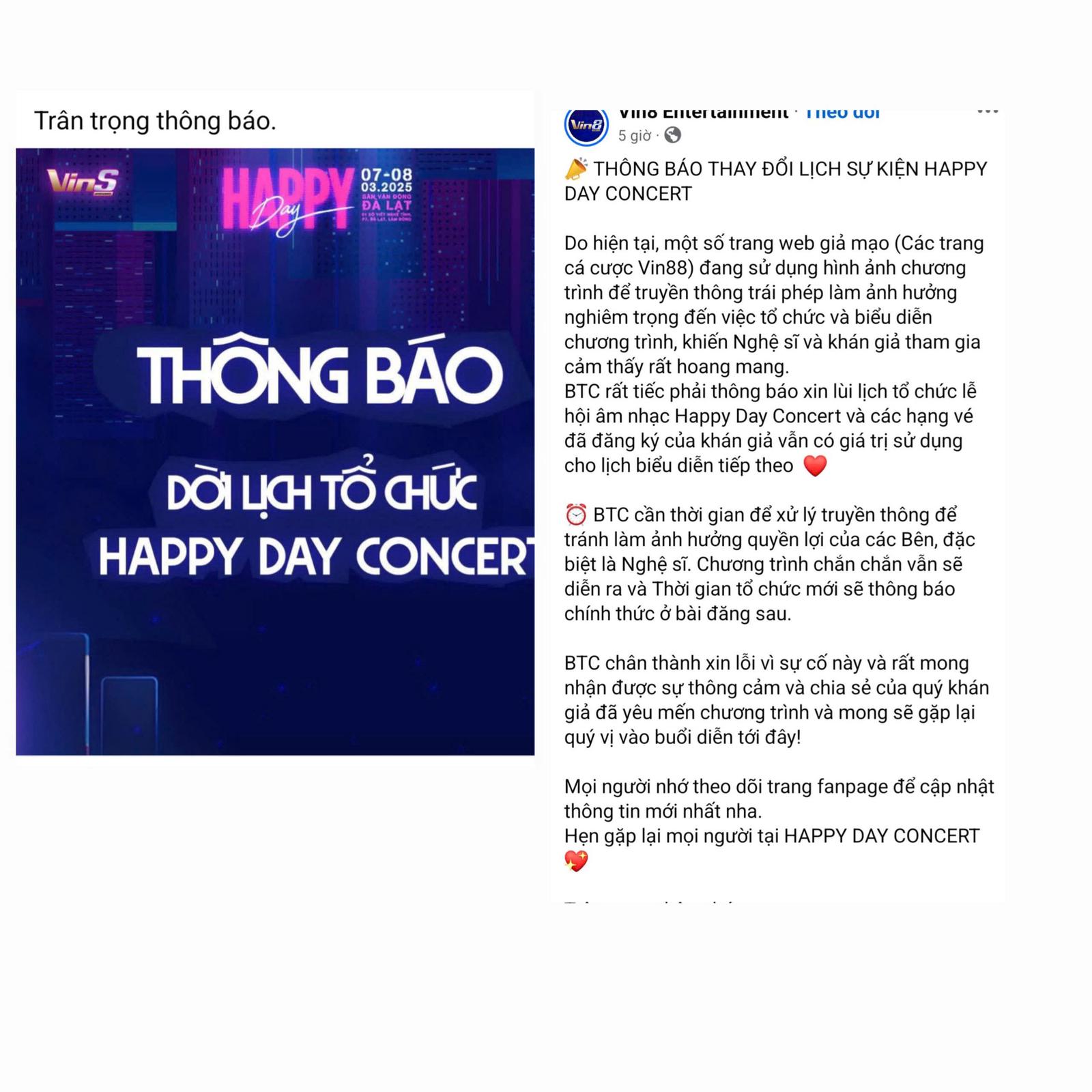 Đến chiều 7/3, Vin8 Entertainment - đơn vị phối hợp tổ chức sự kiện trên đã đăng tải thông báo thay đổi lịch sự kiện. Phía này đưa ra lý do: “Do hiện tại, một số trang web giả mạo (các trang cá cược…) đang sử dụng hình ảnh chương trình để truyền thông trái phép làm ảnh hưởng nghiêm trọng đến việc tổ chức và biểu diễn chương trình, khiến nghệ sĩ và khán giả tham gia cảm thấy rất hoang mang.