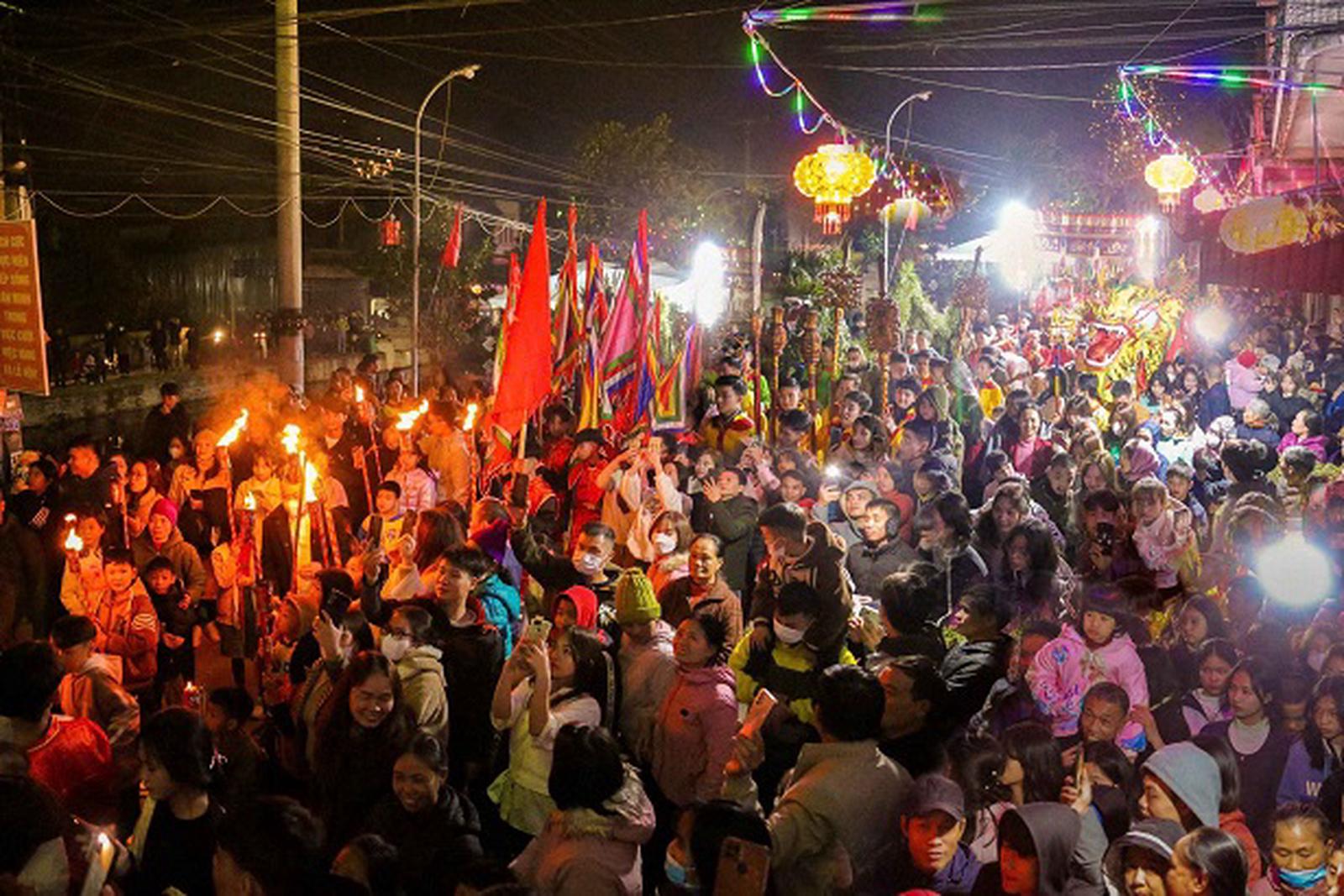 Nhân dân địa phương tham gia đoàn rước xông đền đêm giao thừa. Ảnh: Nguyễn Xuân Cao