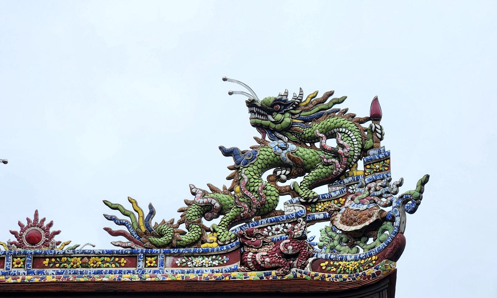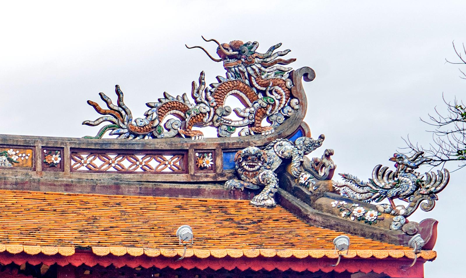 Con rồng cũng như Tứ linh đã vượt ra khỏi hoàng cung, trở thành vật trang trí mang nhiều ý nghĩa tâm linh trên mái nhà thờ, đình làng của người dân cố đô Huế. Ảnh: Minh Tân