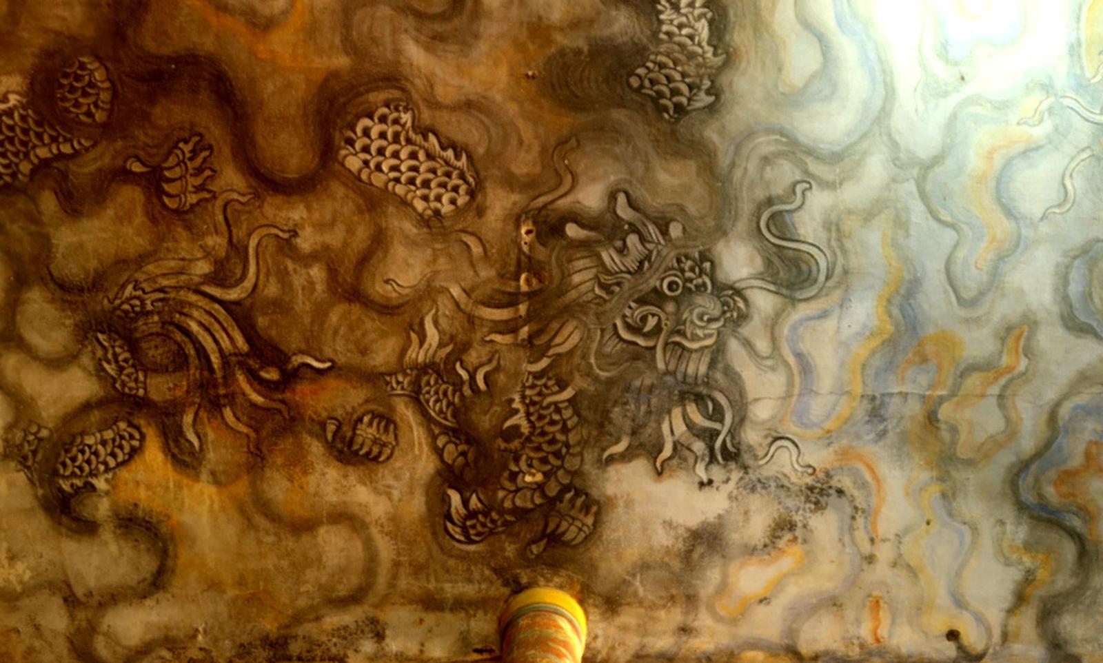 Bức tranh “Cửu long ẩn vân” do họa sĩ Phan Văn Tánh, dưới triều Nguyễn vẽ hình 9 con rồng vờn trong mây tại chùa Diệu Đế. Ảnh: Minh Tân