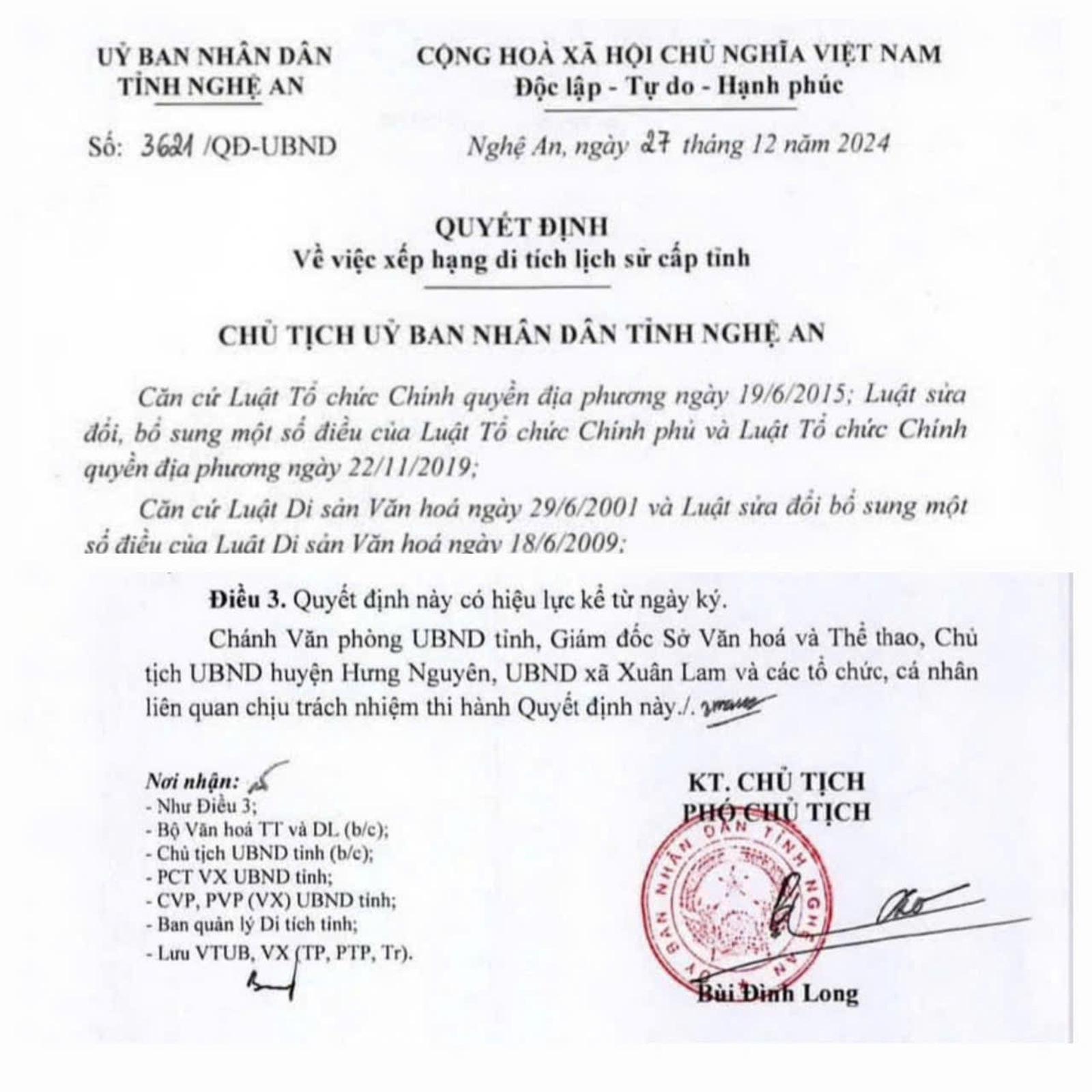 Quyết định xếp hạng di tích lịch sử cấp đối với bến đò Cố Xin. Ảnh: Minh Đức