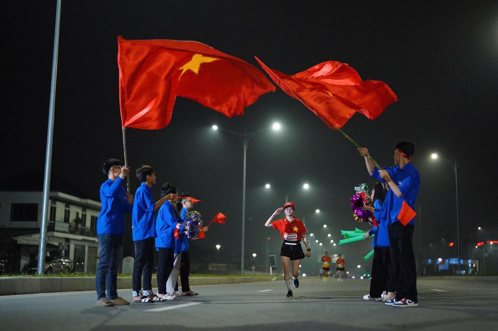 Các vận động viên mang theo cờ Tổ quốc trên đường đua, thể hiện tinh thần yêu nước nồng nàn. Ảnh: BTC cung cấp