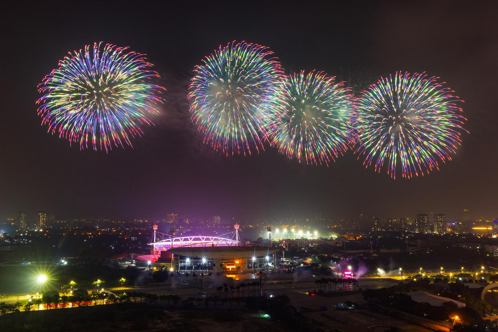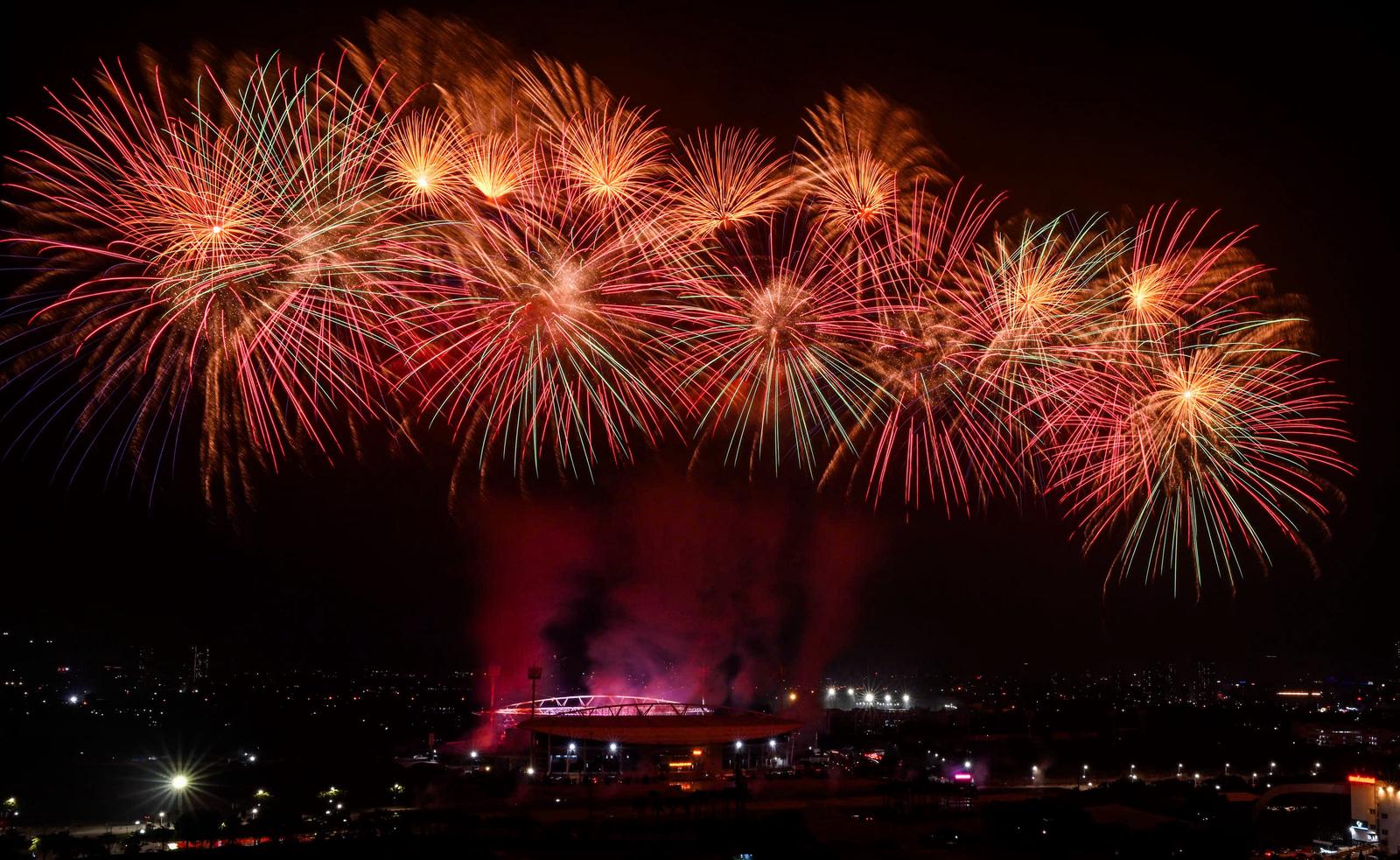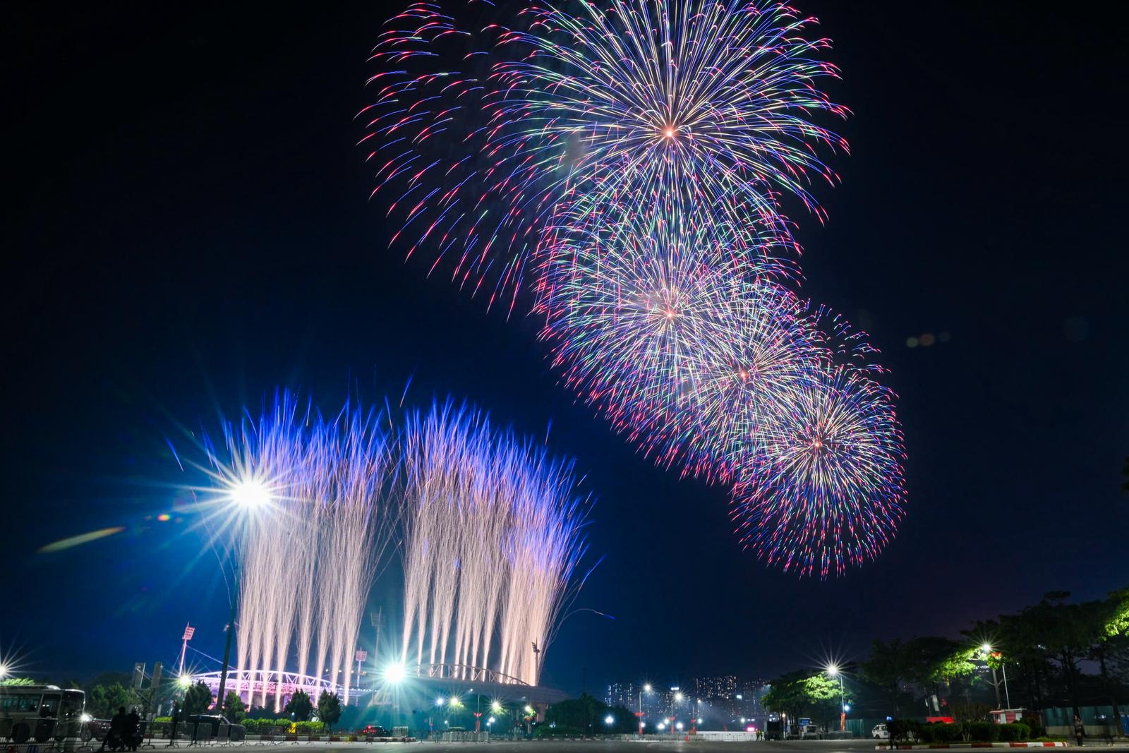 Đứng cách sân vận động cả vài trăm mét, anh Hoàng Hưng (Mỹ Đình, Hà Nội) vẫn có thể ngắm trọn vẹn màn trình diễn và chia sẻ: “Mới chỉ ở quy mô trận địa 100 đơn vị pháo thử nghiệm mà đã thấy rất choáng ngợp. Nếu hôm chính thức bắn gần 10.000 quả thì chắc chắn sẽ còn hoành tráng và cảm xúc hơn rất nhiều. Đây thực sự là một màn trình diễn nghệ thuật của ánh sáng và âm nhạc”. Ảnh: Thanh Giang
