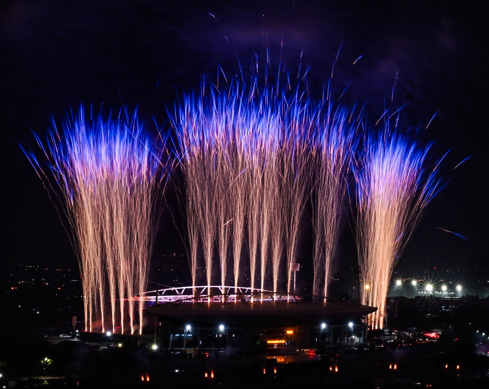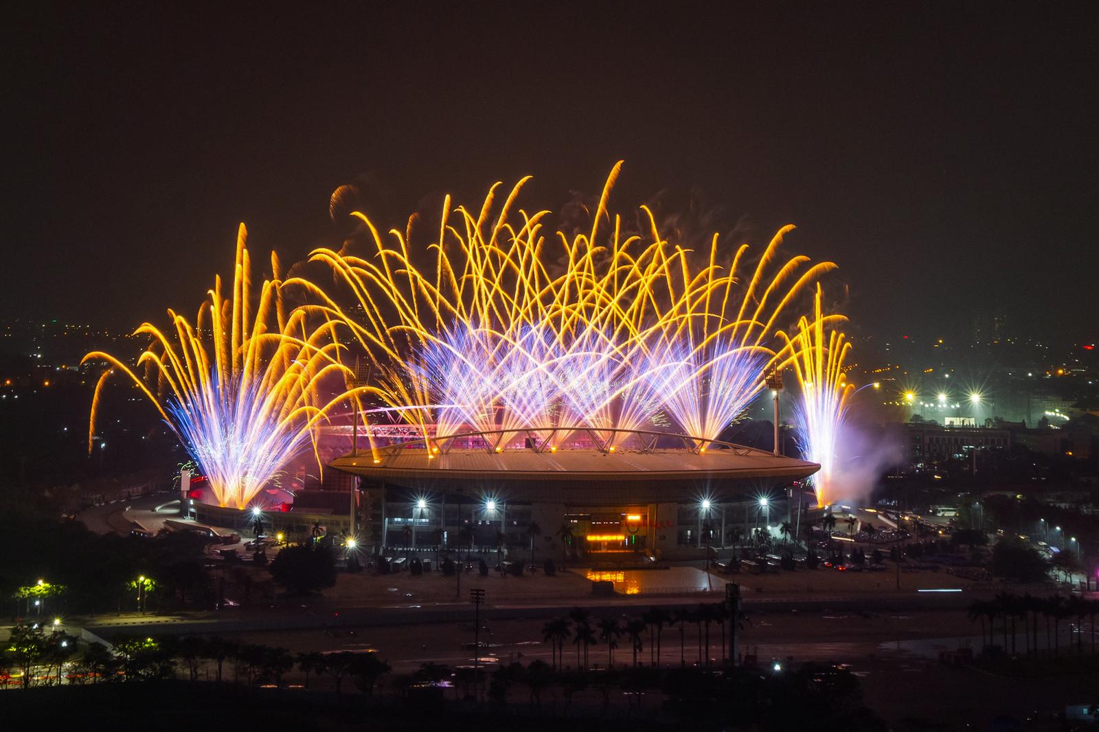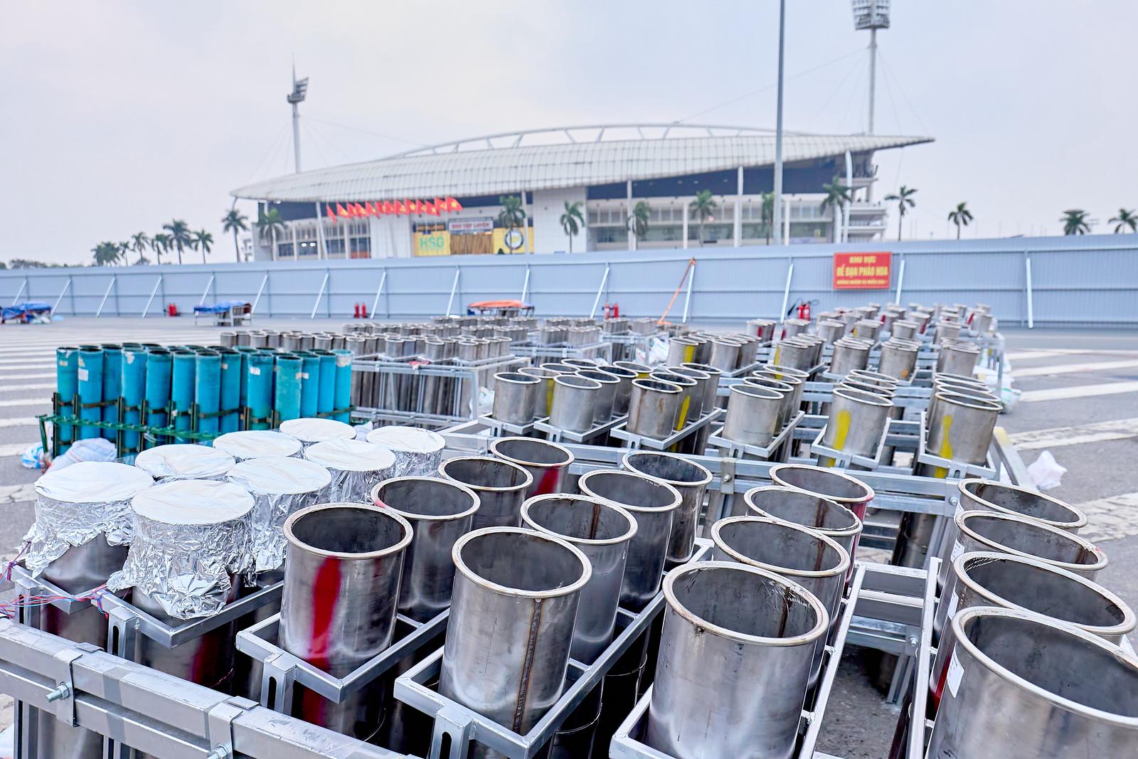 Đặc biệt, bố trí quanh khu vực khán đài B sân vận động là pháo hoa hỏa thuật ống đơn với độ cao ước tính 50 – 90m, cùng các giàn pháo hỏa thuật loại 1.2 inch độ cao khoảng 50 – 60m. Tất cả sẽ tạo nên những lớp hiệu ứng ánh sáng liên hoàn, đa tầng, bao phủ toàn bộ không gian trình diễn, tạo nên “bữa tiệc” của âm thanh và ánh sáng. Ảnh: Thanh Giang
