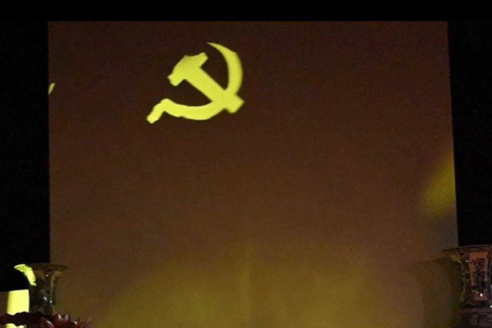 Khi khối gỗ xoay chuyển, biểu tượng búa liềm vàng - đại diện cho Đảng Cộng sản Việt Nam dần lộ diện. Ảnh: Hoàng Hiệp