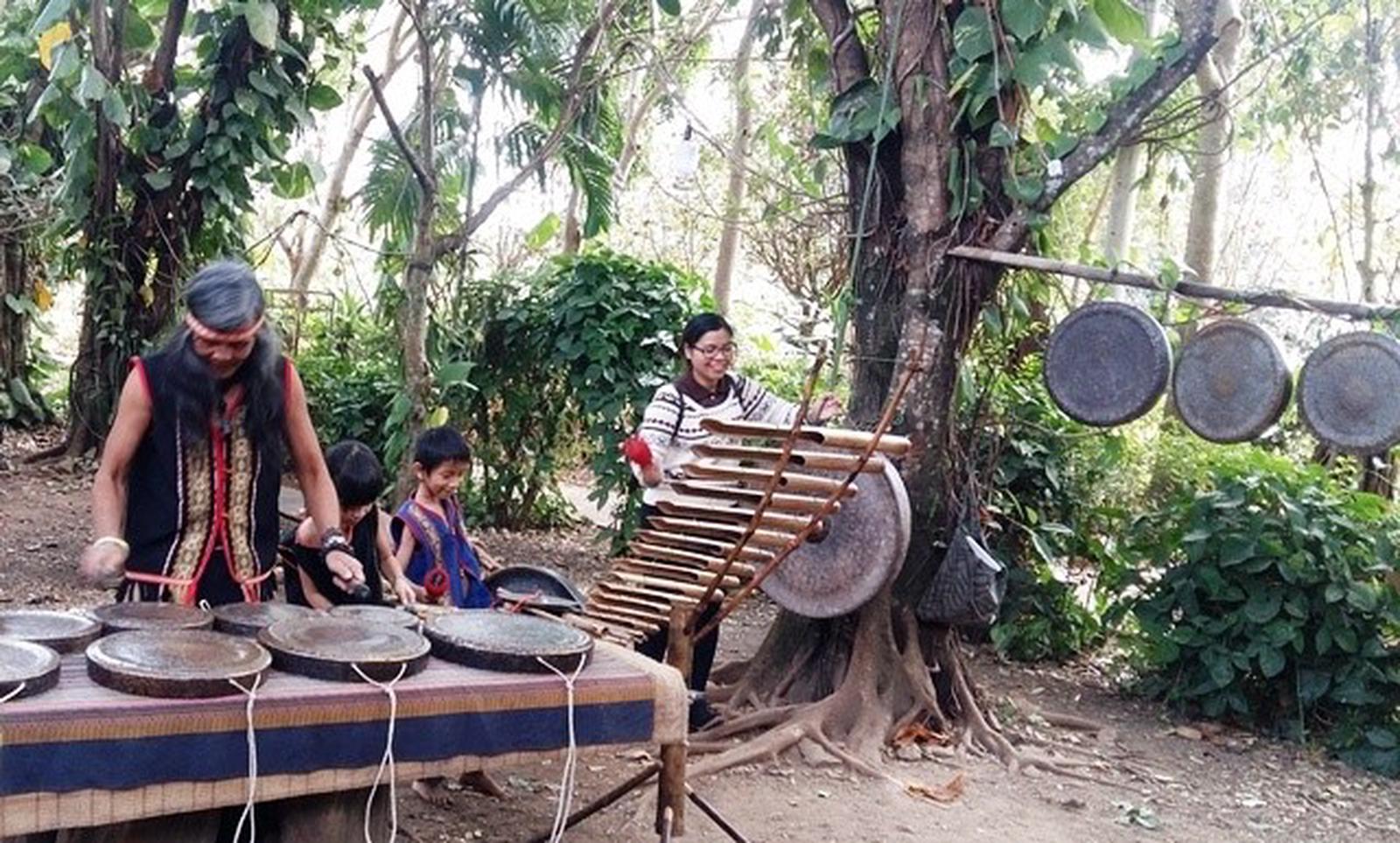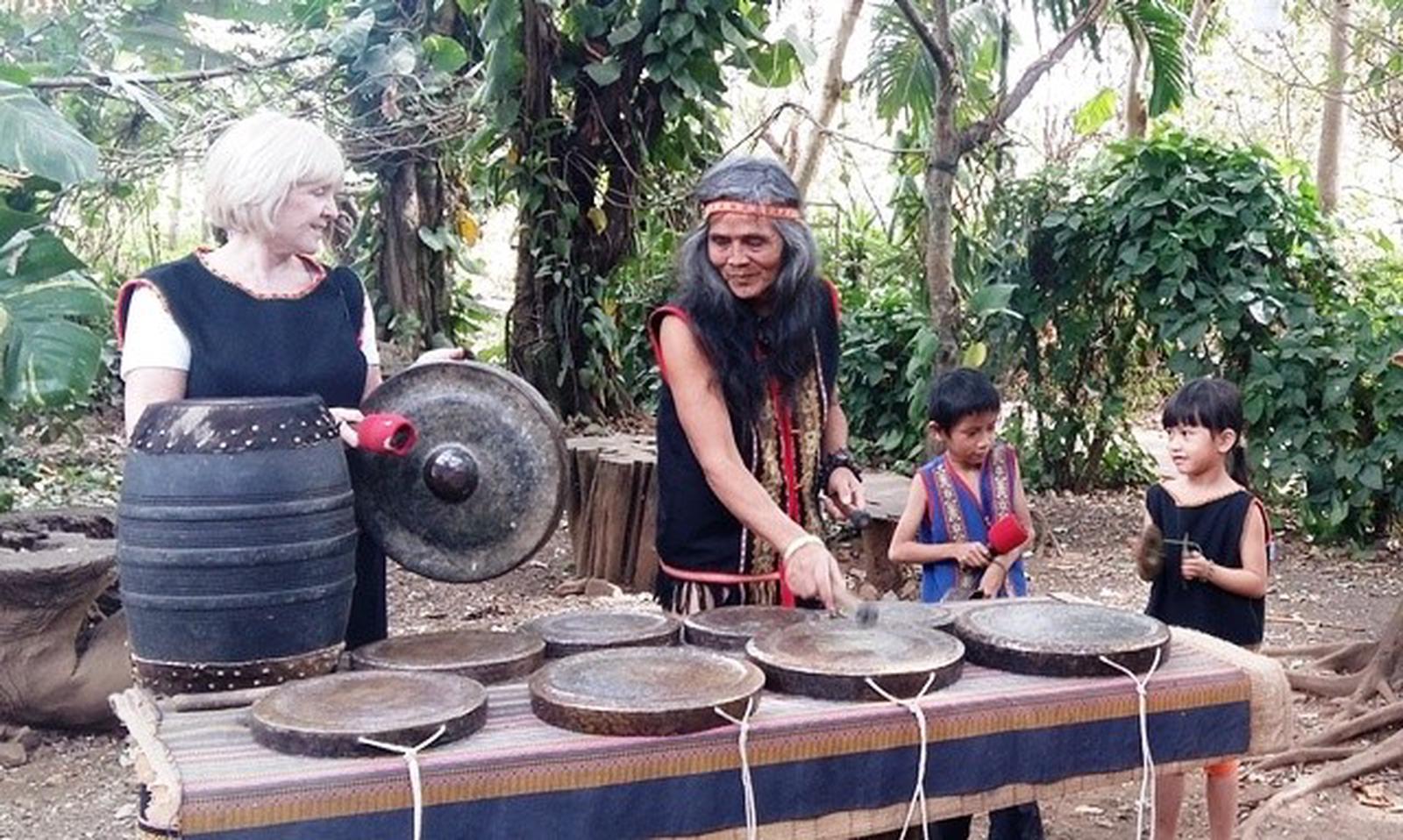 Nghệ nhân A Biu cùng du khách trải nghiệm âm thanh của tiếng chiêng. Ảnh: Thúy Hạnh
