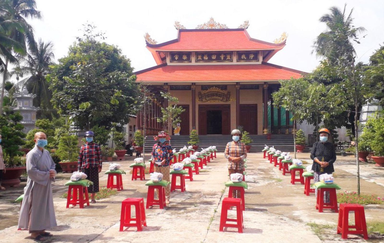 Tương tự, ngày 8/8, Hoà thượng, Viện chủ Thích Chơn An và Đại đức Thích Lệ Huệ, Trụ trì chùa Long Tường (ấp 5, xã Tam Hiệp, huyện Châu Thành) cùng Phật tử tại đạo tràng tổ chức phiên chợ 0 đồng, trao tặng 400 phần quà cho bà con trong 7 ấp và 1 khu phố thuộc địa bàn xã Tam Hiệp, huyện Châu Thành gặp khó khăn trong đại dịch Covid-19…