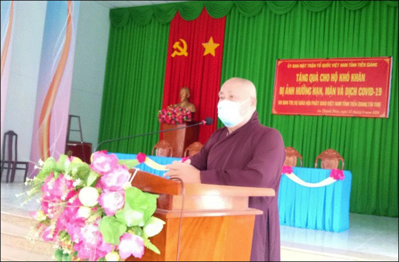 Hòa thượng Thích Huệ Minh - Trưởng Ban Trị sự GHPGVN tỉnh Tiền Giang phát biểu trong một buổi trao quà hỗ trợ người dân bị ảnh hưởng bởi dịch Covid-19. Ảnh: Ban TTTT Phật giáo tỉnh Tiền Giang