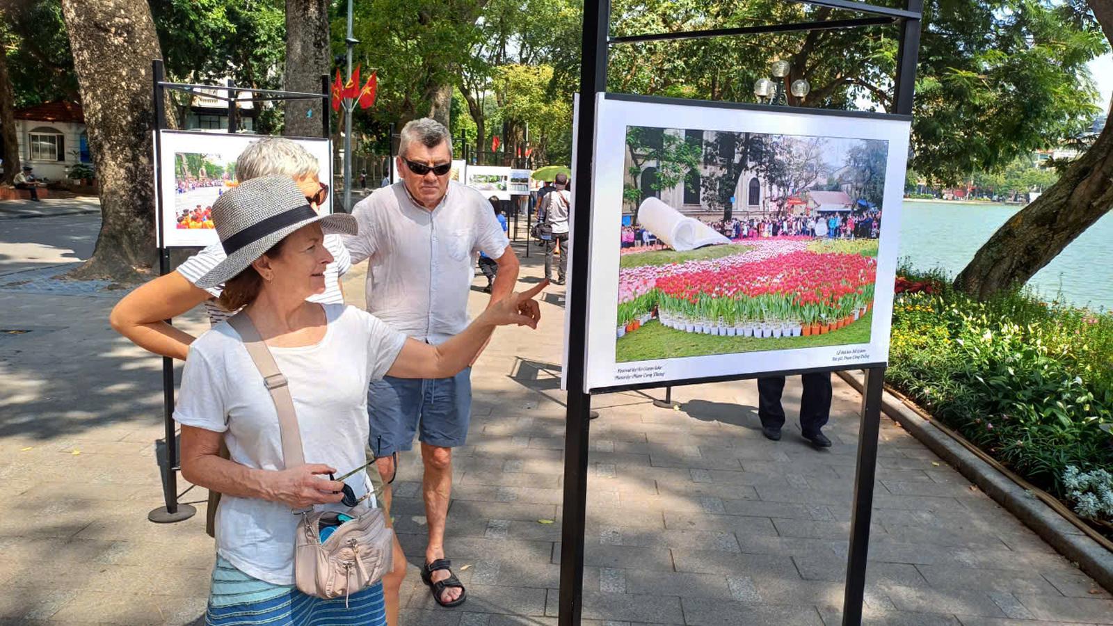 Du khách nước ngoài tham quan triển lãm ảnh “ Hà Nội trong tôi” bên hồ Hoàn Kiếm, Hà Nội.