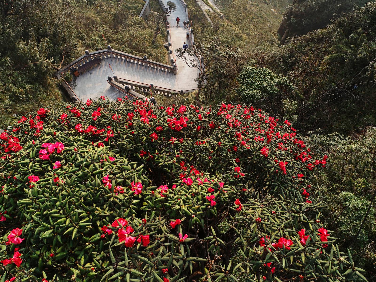 Đây cũng là thời điểm lý tưởng để “săn” hoa đỗ quyên - loài hoa đặc trưng của dãy Hoàng Liên Sơn, mỗi năm chỉ nở duy nhất một mùa. Từ trên tuyến cáp treo Fansipan kỷ lục thế giới lướt giữa lưng chừng trời, du khách sẽ thỏa sức phóng tầm mắt trên những triền núi điệp trùng ngắm từng vạt đỗ quyên rực đỏ như đốm lửa, hay chiêm ngưỡng, chụp ảnh cùng loài hoa quý được khu du lịch ươm trồng đang rộ nở rực rỡ xen giữa hàng trăm cây anh đào Nhật Bản tại khu vực ga đi cáp treo và trên đường lên đỉnh.