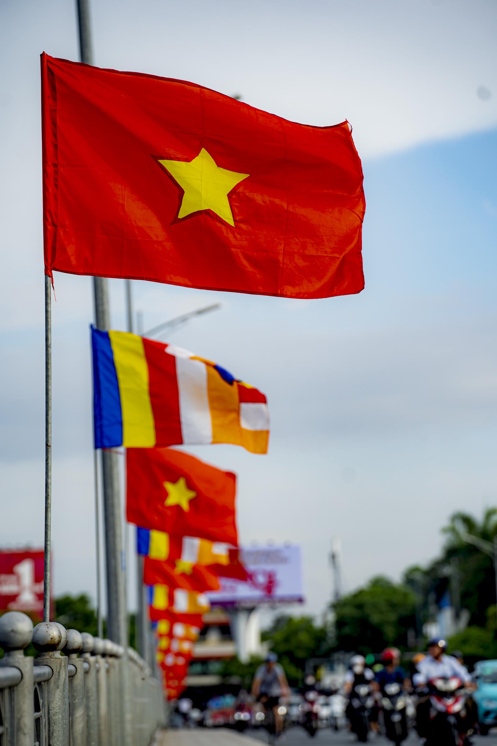 Cờ Tổ quốc và cờ Phật giáo trang trí đan xen, thể hiện tinh thần Đạo pháp - Dân tộc - Chủ nghĩa xã hội.