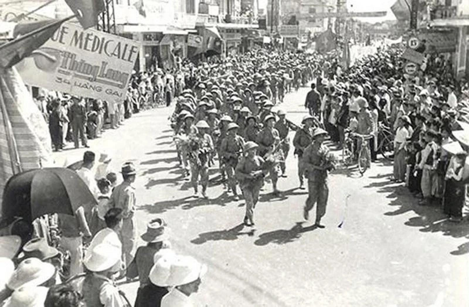 Các chiến sĩ Đại đoàn 308 hành quân trên phố Hàng Gai Thủ đô Hà Nội. Ảnh: TL