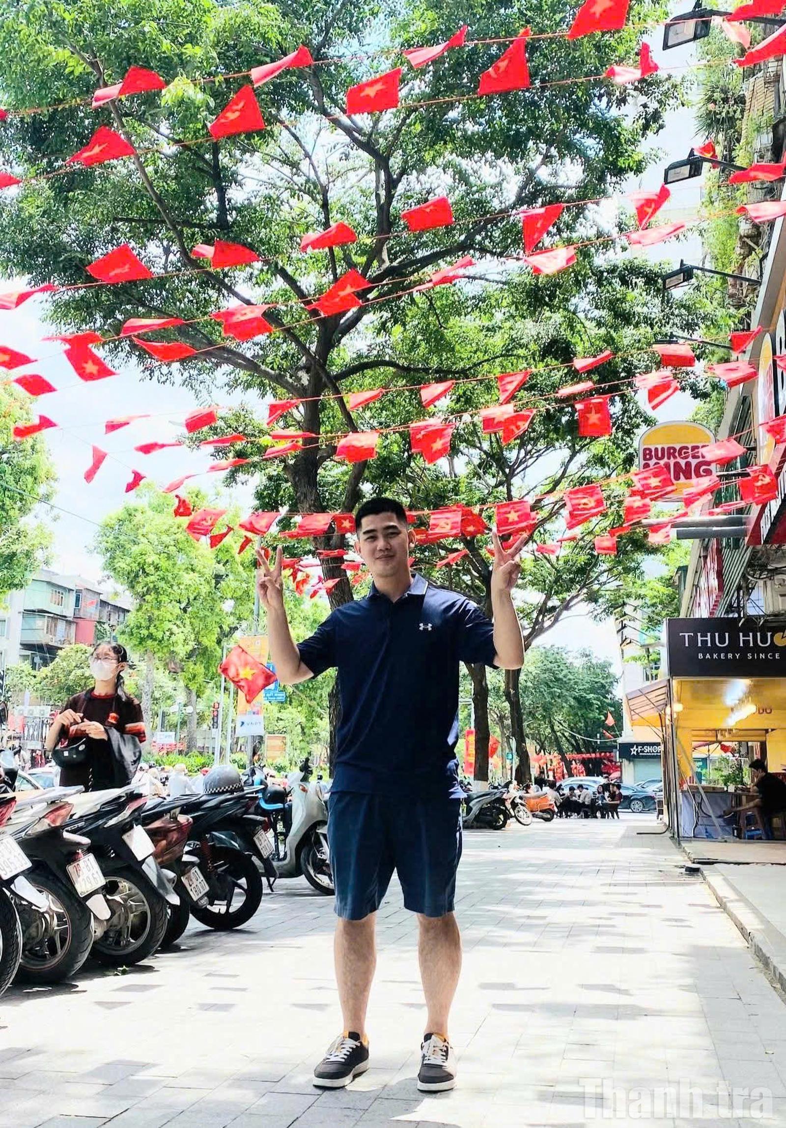 Thầy Willy Ngu thích thú chụp ảnh trên con phố rực rỡ cờ đỏ sao vàng, hoà cùng niềm vui của dân tộc Việt Nam. Ảnh: Trí Vũ