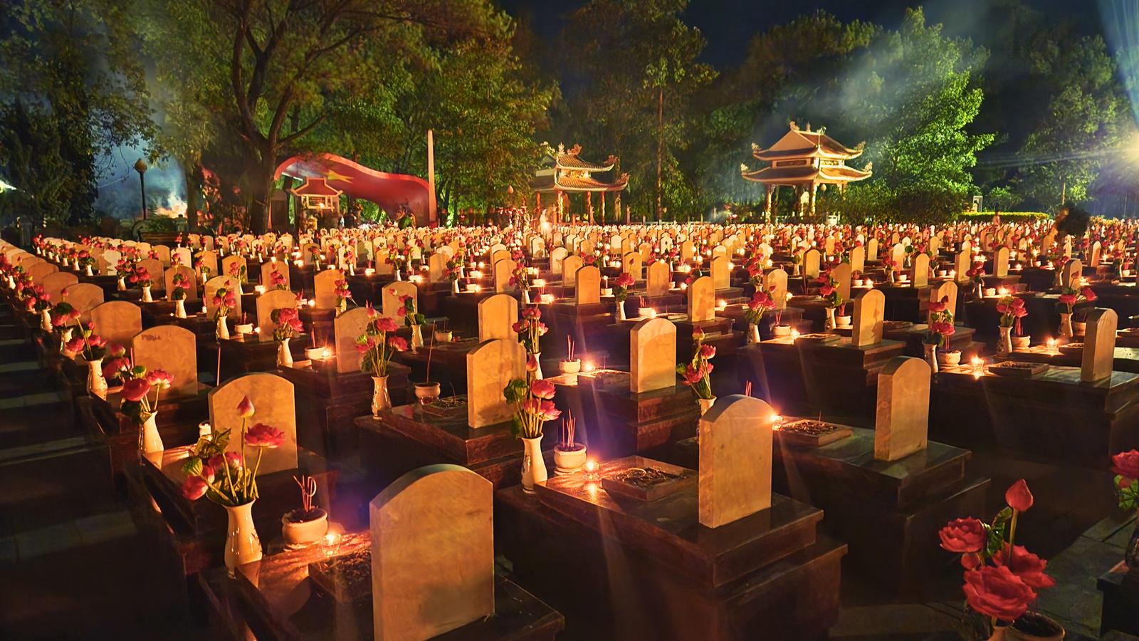 Mỗi ngọn nến là một lời chào Xuân lặng lẽ, để những người nằm lại Trường Sơn biết rằng đất nước vẫn đang đi tiếp từ sự hy sinh của các anh. Ảnh: Minh Tân
