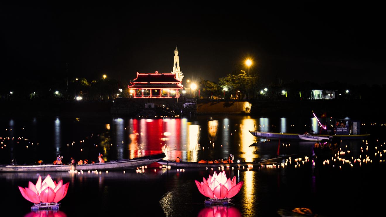 Những ngọn hoa đăng lặng lẽ trôi, mang theo ánh sáng của hôm nay gửi về những tuổi hai mươi đã hóa thân vào sóng nước nơi này. Ảnh: Minh Tân