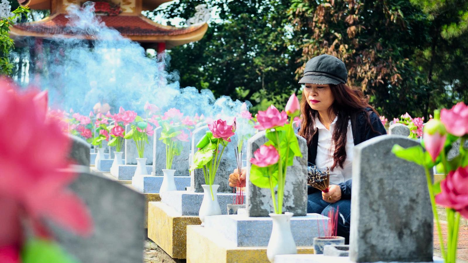 Giữa hàng bia liệt sĩ trong nắng Xuân, nén hương được thắp lên lặng lẽ bên những đóa sen hồng là lời sự tri ân của thế hệ hôm nay nay gửi đến những tuổi hai mươi đã hóa thân và đất nước. Ảnh: Minh Tân