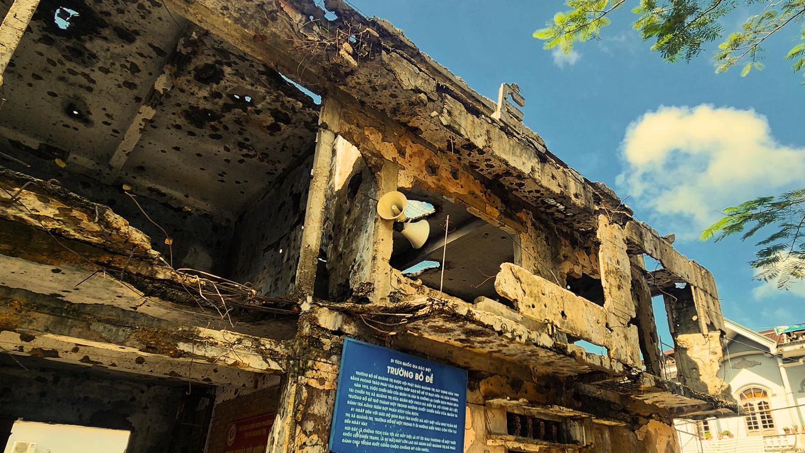 Những mảng tường loang lổ vết bom đạn vẫn còn đó, lặng lẽ kể về một thời khốc liệt, để giữa bầu trời xanh hôm nay, hòa bình hiện lên trọn vẹn và đáng trân quý hơn bao giờ hết. Ảnh: Minh Tân