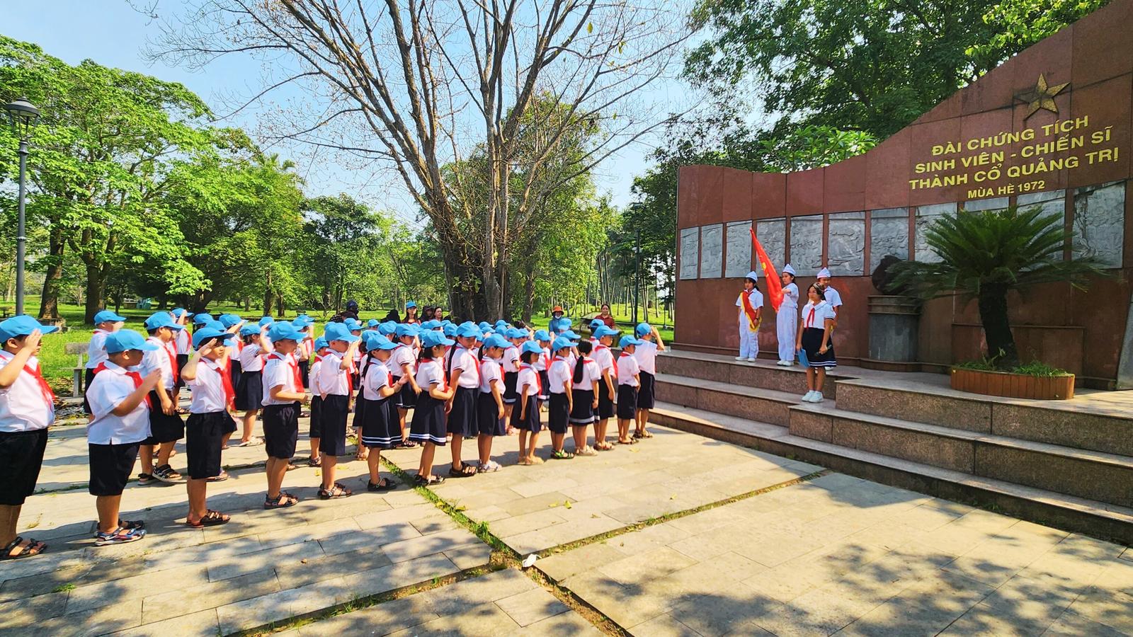 Giữa màu xanh cây lá và nắng mới, những bàn tay nhỏ giơ cao chào cờ - như lời hứa lặng lẽ của thế hệ hôm nay tiếp nối tuổi thanh xuân đã hóa thành bất tử nơi mảnh đất thiêng này. Ảnh: Minh Tân