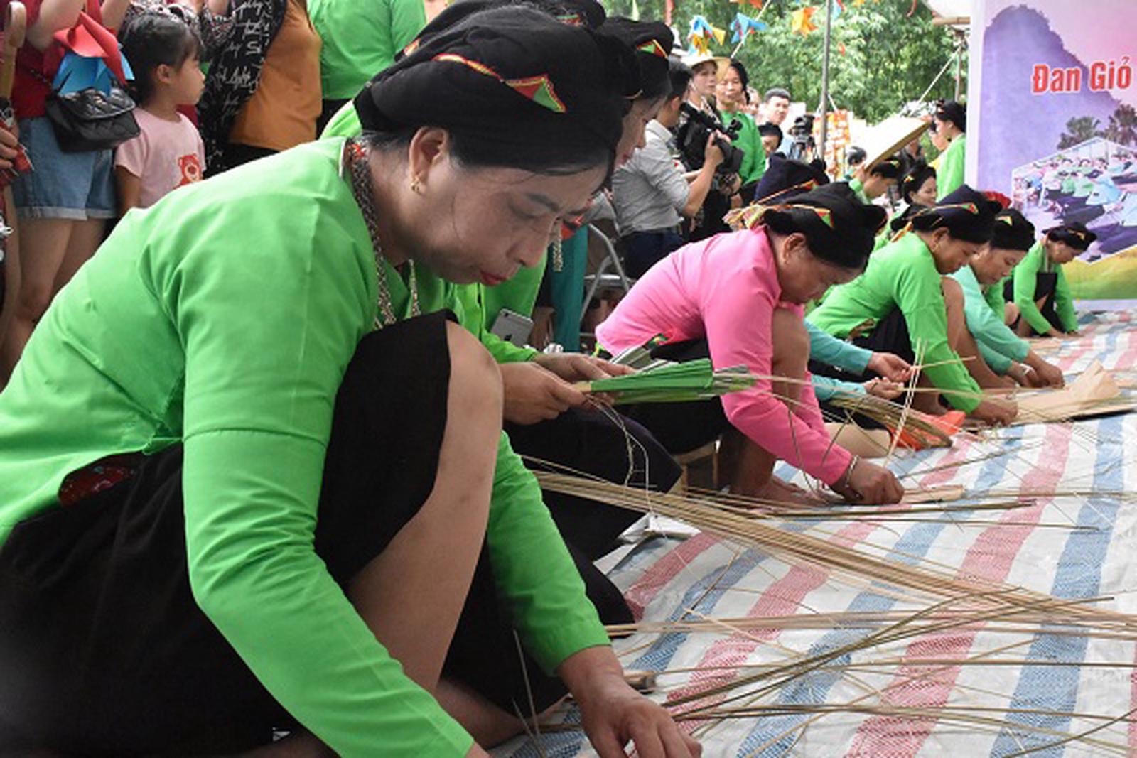 Phụ nữ dân tộc Tày tham gia cuộc thi đan giỏ đựng cá. Ảnh: Bùi Bình