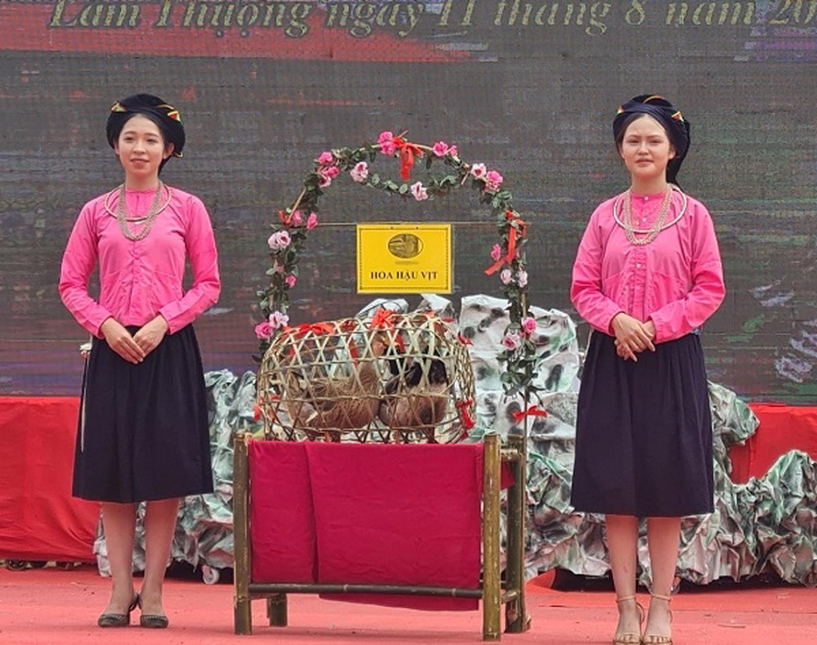 Đôi vịt được giải hoa hậu vịt đã được một du khách đấu giá với mức giá 3,8 triệu đồng. Ảnh: Bùi Bình
