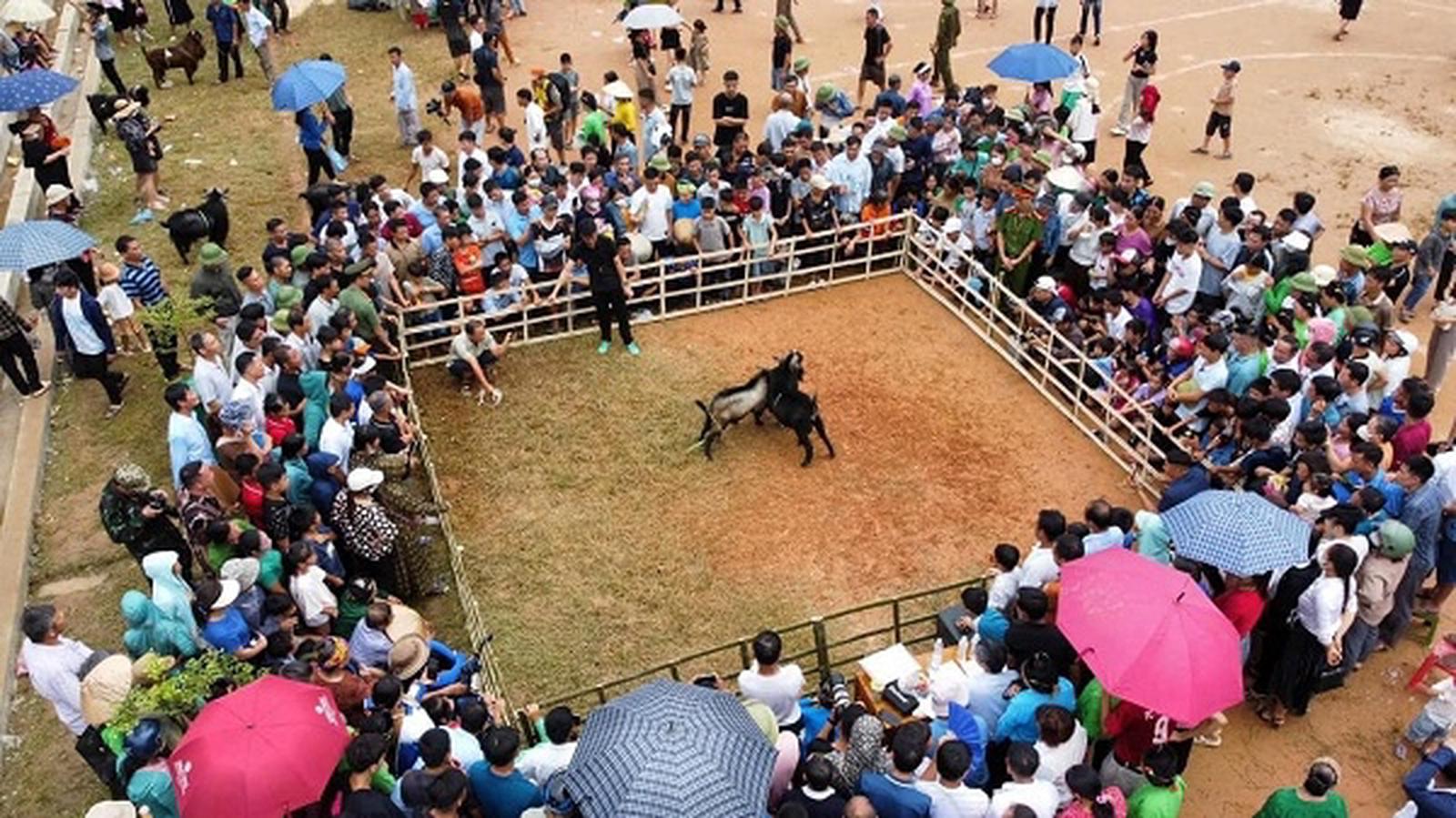 Du khách thích thú với tiết mục thi chọi dê. Ảnh: Bùi Bình