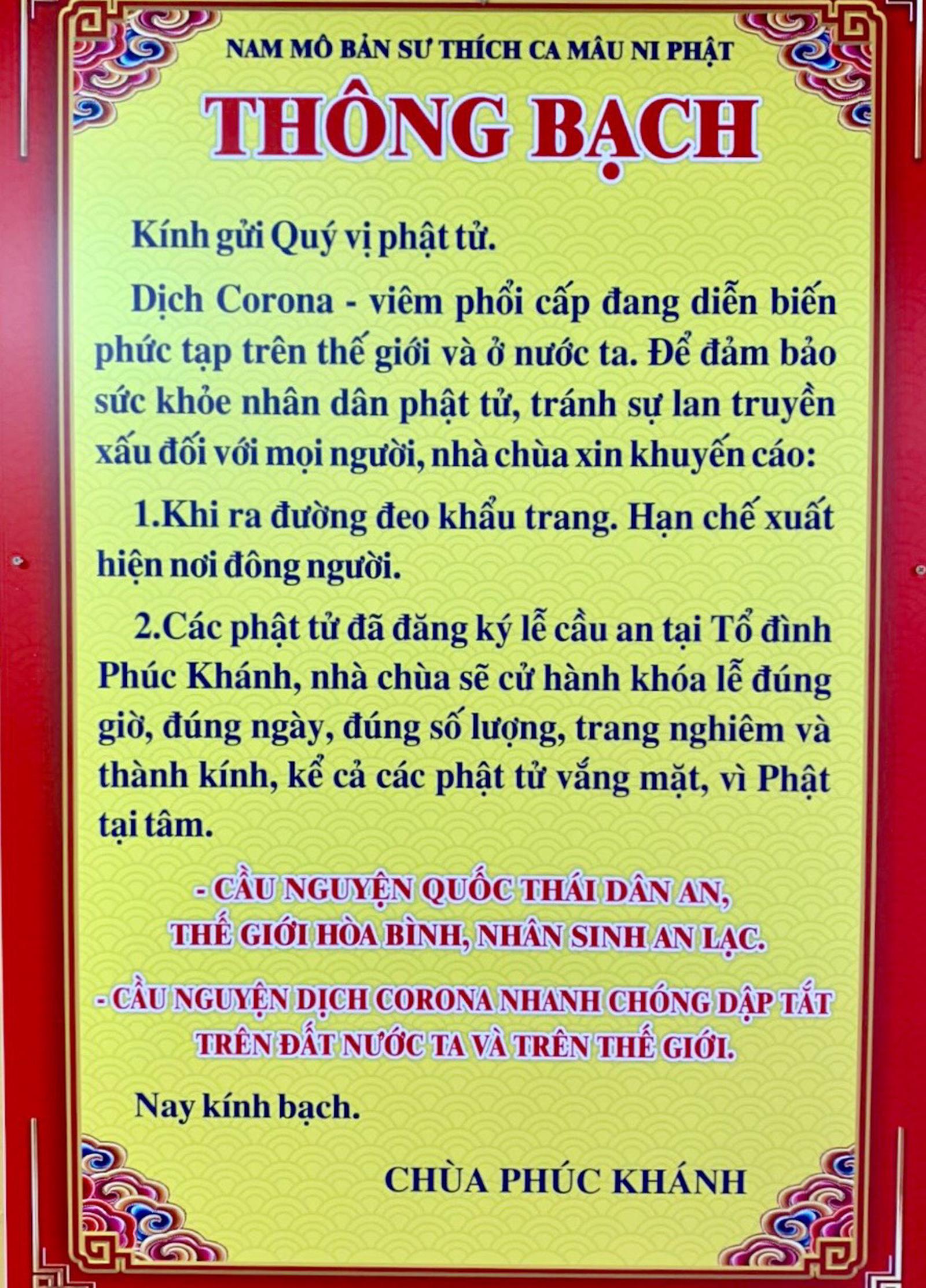 Chùa Phúc Khánh ra Thông bạch để khuyến cáo người dân trước đại dịch Corona cần cân nhắc khi đi lễ