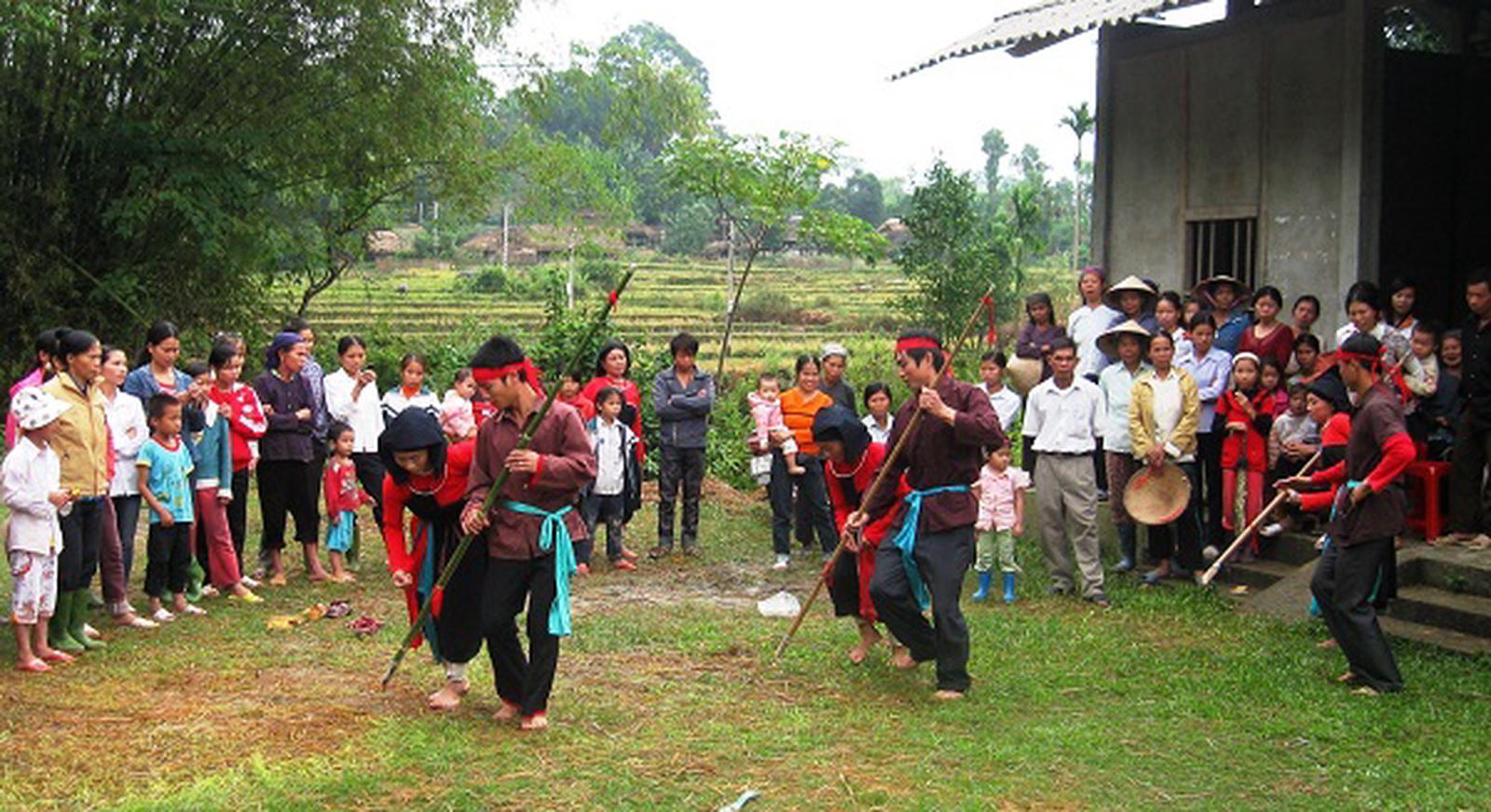 Câu lạc bộ Văn nghệ dân gian xã Vũ Linh, huyện Yên Bình luyện tập điệu múa Tra hạt. Ảnh: Bùi Bình