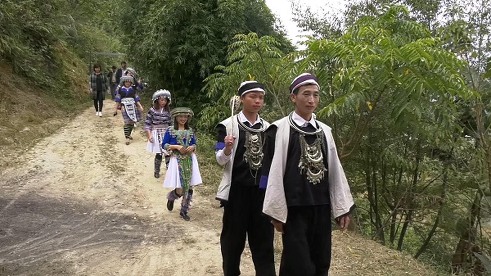Các chàng trai, cô gái trong trang phục người Mông tại Lễ rước dâu. Ảnh: Bùi Bình