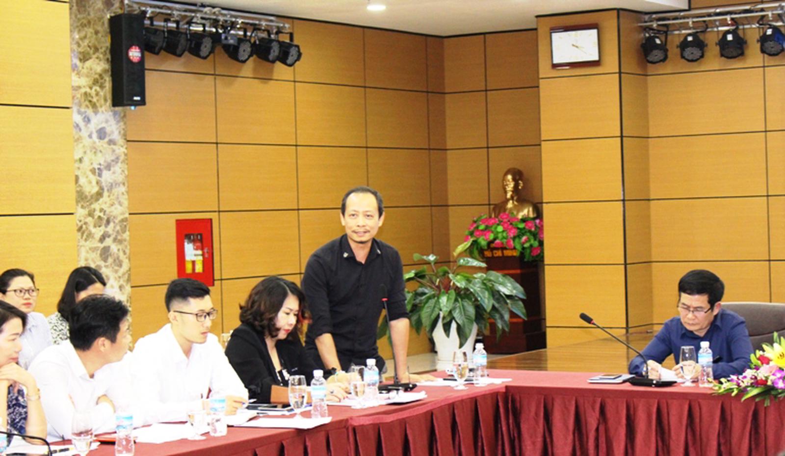 Ông Phạm Hoàng Nam, Tổng Đạo diễn Chương trình Carnaval 2018 trả lời một số câu hỏi của báo chí về kịch bản chương trình. Ảnh: Trọng Tài
