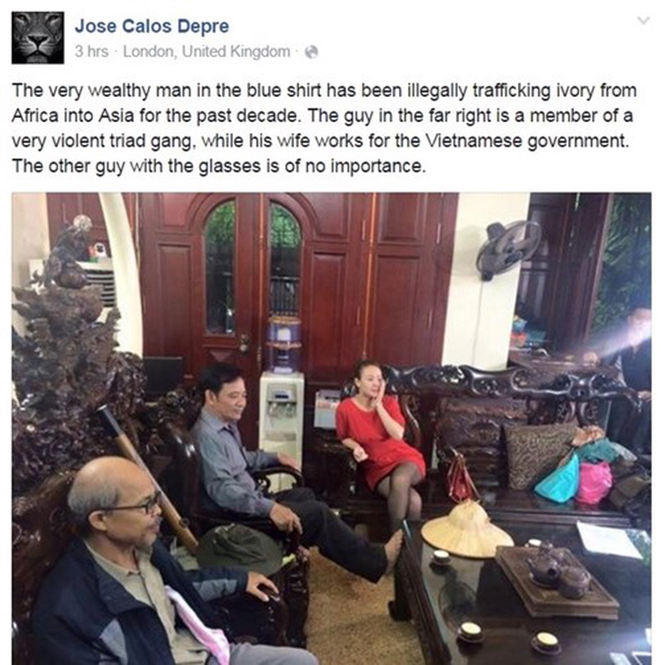Trưa 9/8, một tài khoản facebook có tên Jose Calos Depre đăng một bức ảnh có nghệ sĩ Quang Tèo, nghệ sĩ Hán Văn Tình cùng dòng chữ: “Người đàn ông rất giàu có trong chiếc áo xanh kia đã buôn lậu ngà voi từ châu Phi sang châu Á trong cả một thập kỷ qua... Người đeo kính còn lại không có gì quan trọng”.