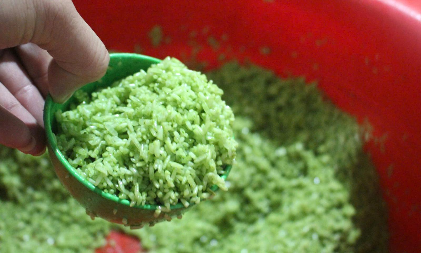 Nếp được ngâm với lá ngót để tạo thành màu xanh đặc trưng của bánh tét mặt trăng. Ảnh: Khánh Anh