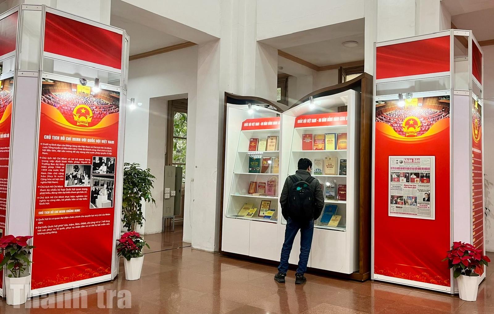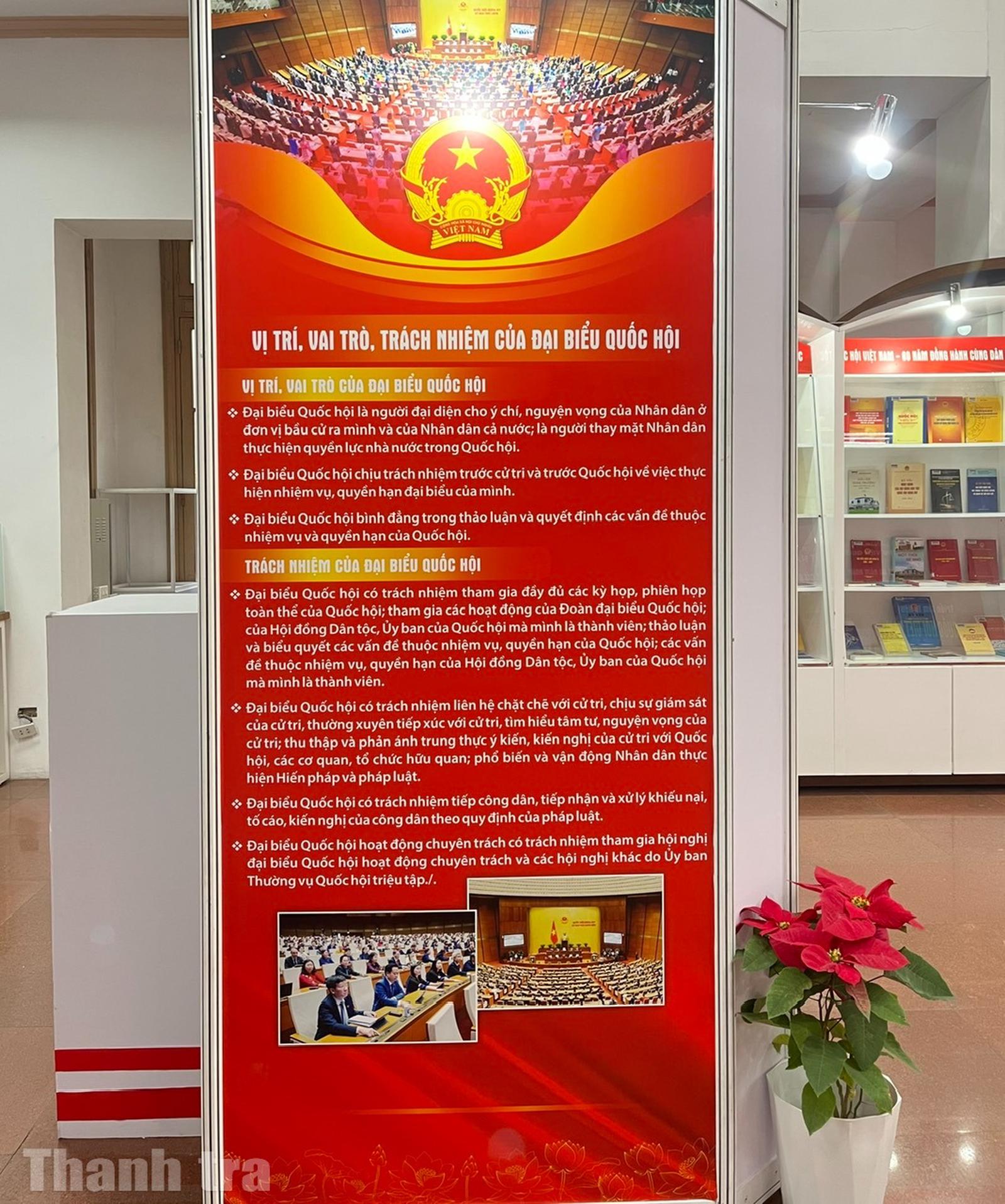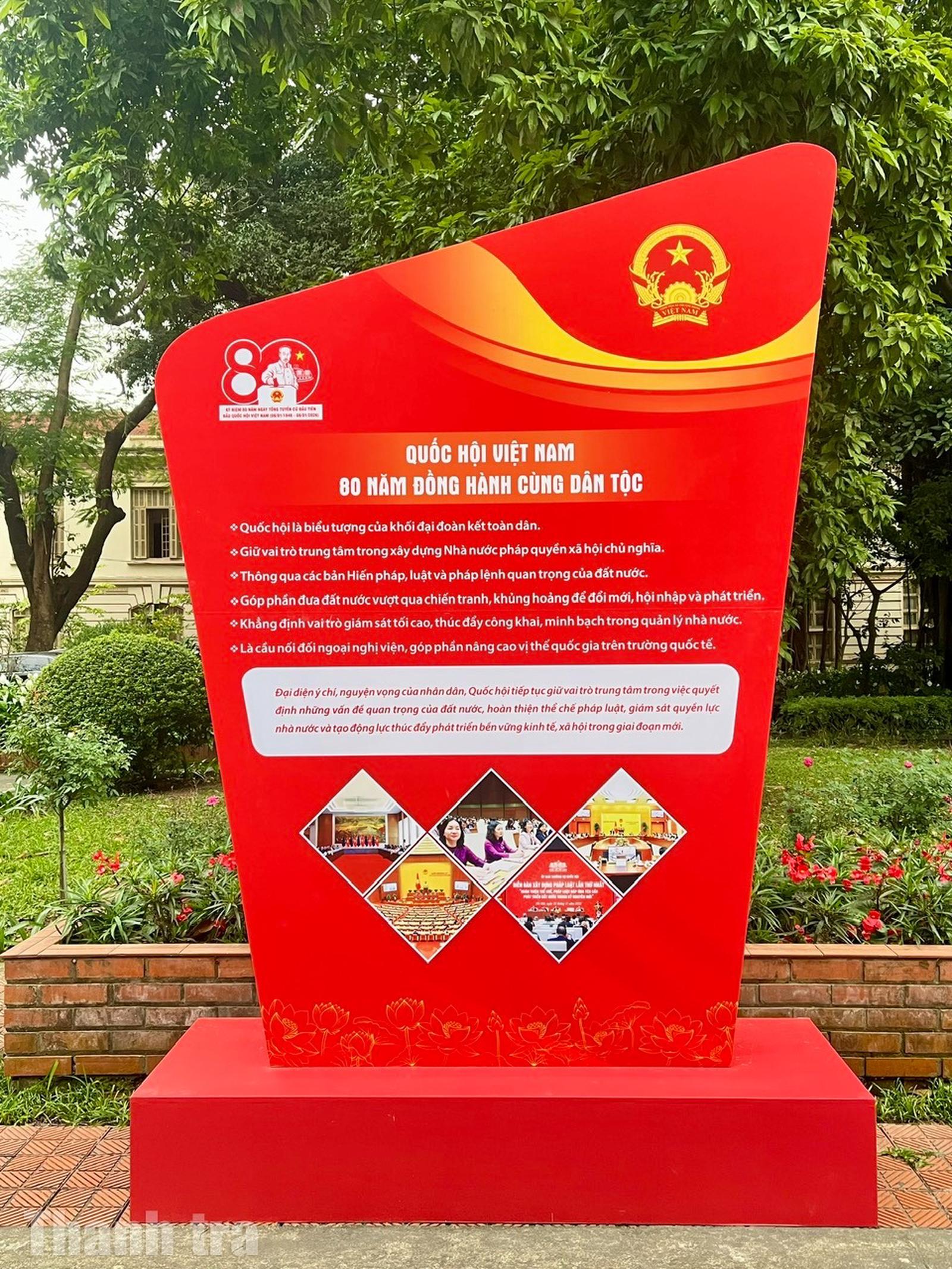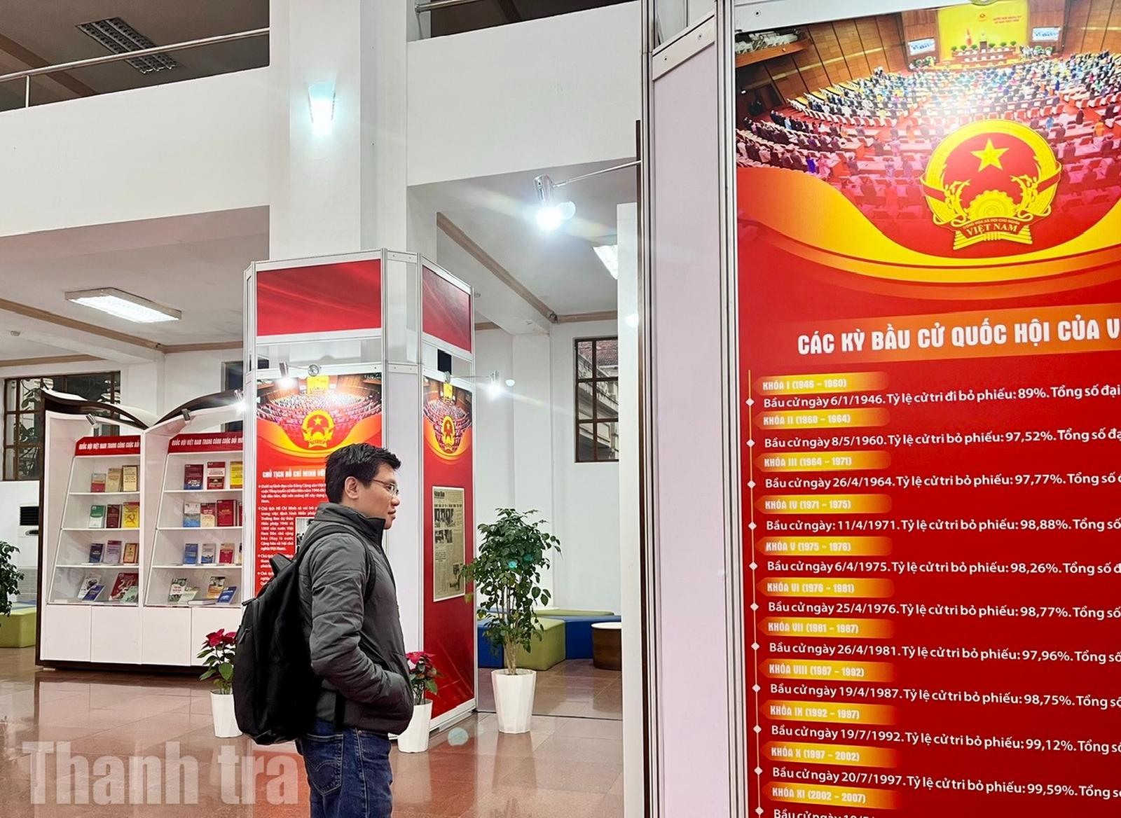 Triển lãm trưng bày 800 tài liệu gồm sách, báo, tạp chí, tranh, ảnh... được tổ chức theo 4 nội dung gắn liền với quá trình xây dựng và phát triển của Quốc hội Việt Nam. Đó là: Tổng tuyển cử năm 1946 - Sự kiện trọng đại trong lịch sử dân tộc Việt Nam; Quốc hội Việt Nam trong hành trình đấu tranh giành độc lập dân tộc và thống nhất đất nước; Quốc hội Việt Nam trong công cuộc đổi mới đất nước; Quốc hội Việt Nam - 80 năm đồng hành cùng dân tộc.