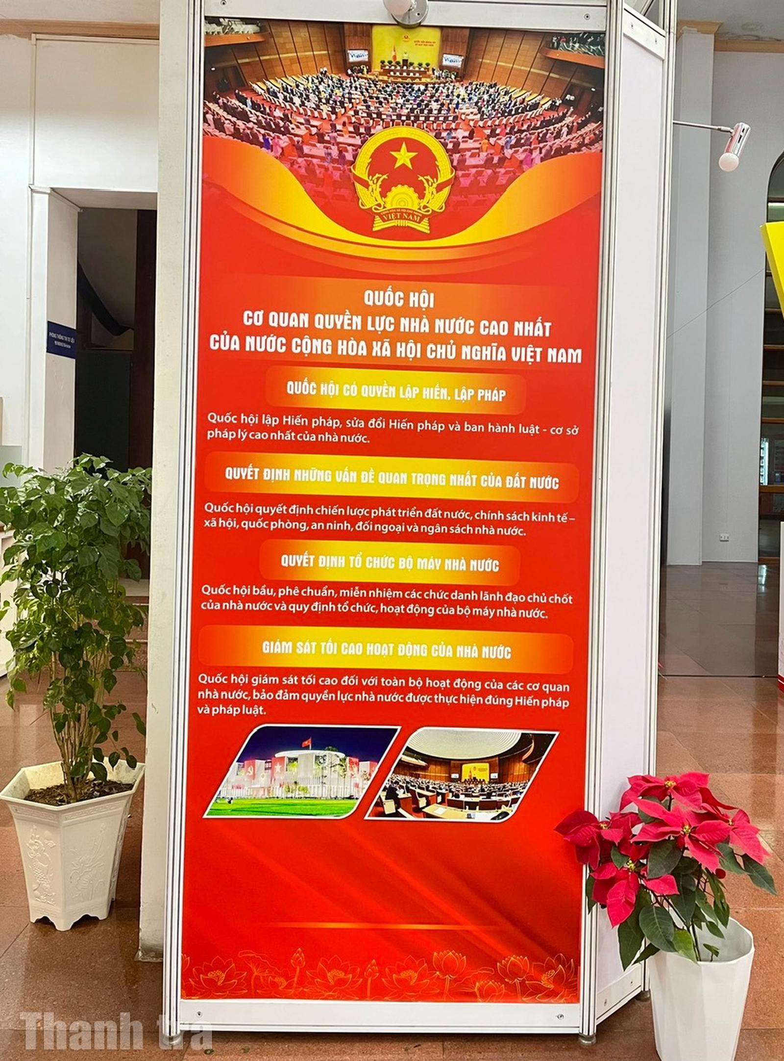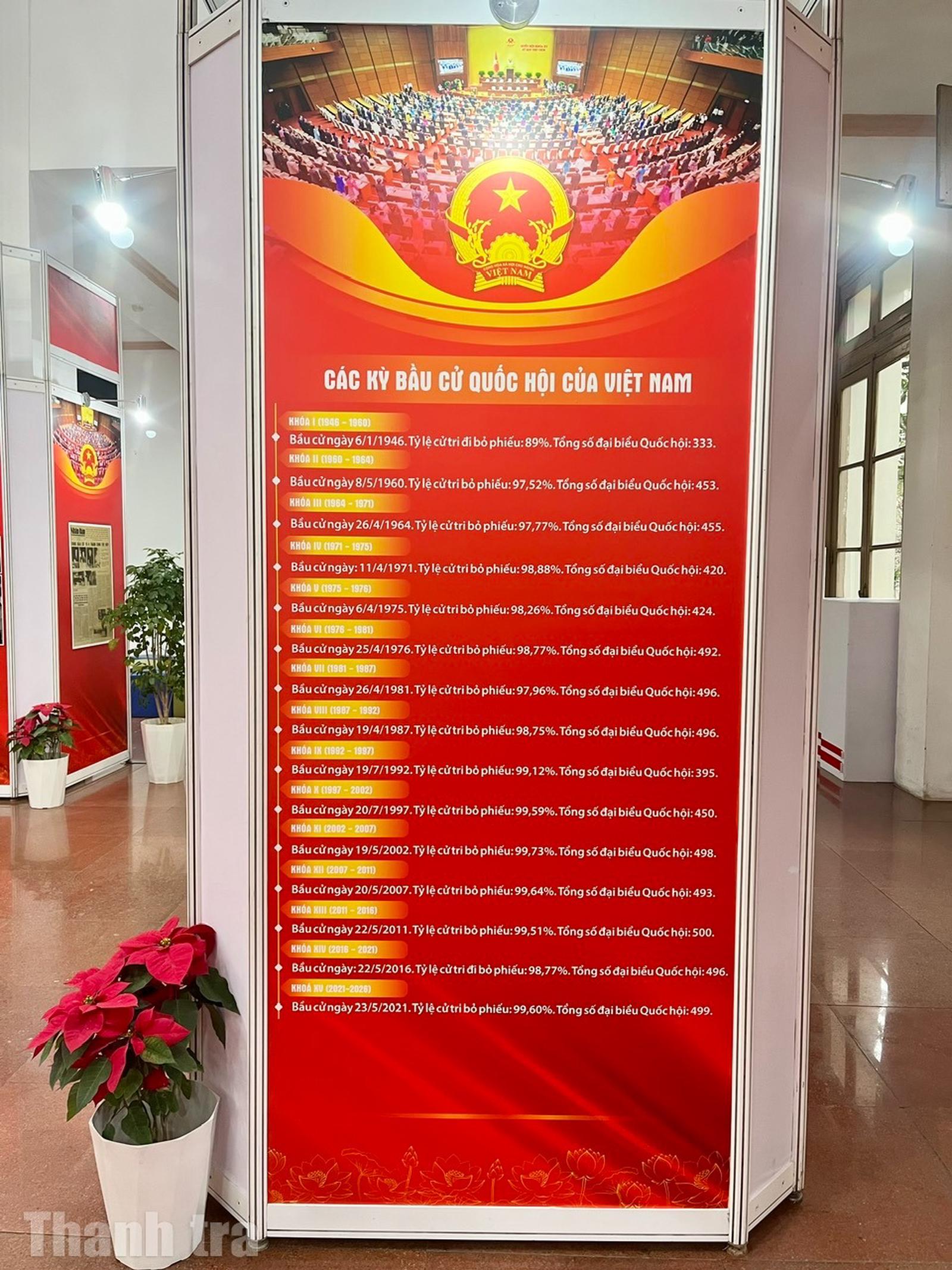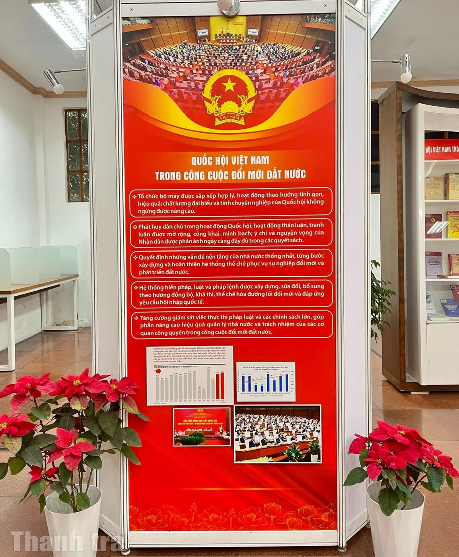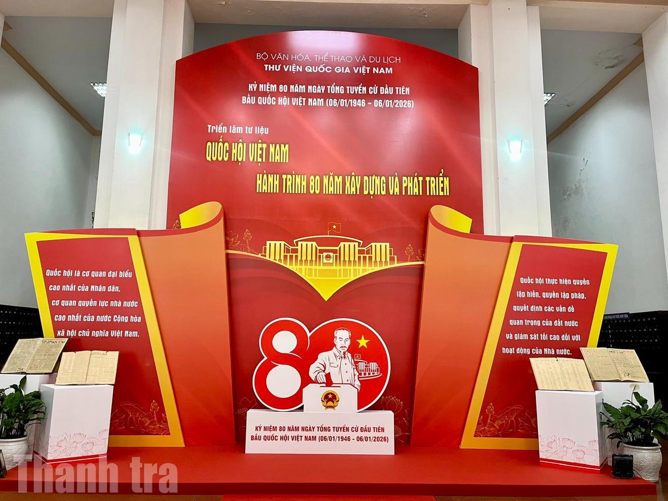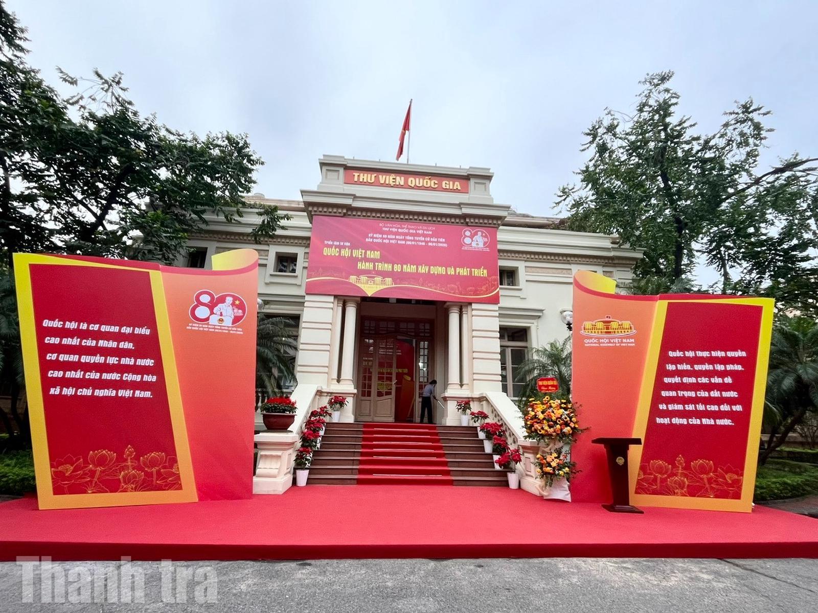 Triển lãm trưng bày 800 tài liệu gồm sách, báo, tạp chí, tranh, ảnh... được tổ chức theo 4 nội dung gắn liền với quá trình xây dựng và phát triển của Quốc hội Việt Nam. Đó là: Tổng tuyển cử năm 1946 - Sự kiện trọng đại trong lịch sử dân tộc Việt Nam; Quốc hội Việt Nam trong hành trình đấu tranh giành độc lập dân tộc và thống nhất đất nước; Quốc hội Việt Nam trong công cuộc đổi mới đất nước; Quốc hội Việt Nam - 80 năm đồng hành cùng dân tộc.
