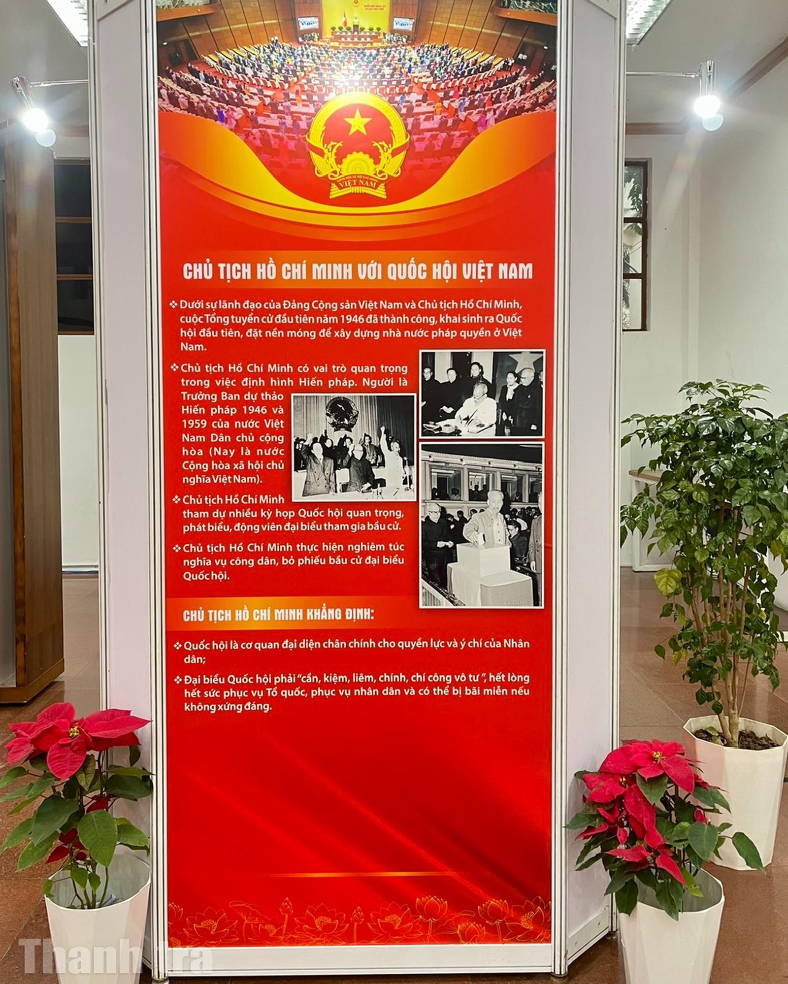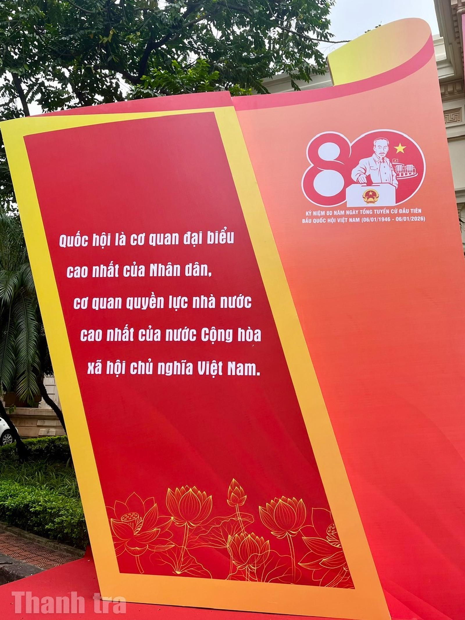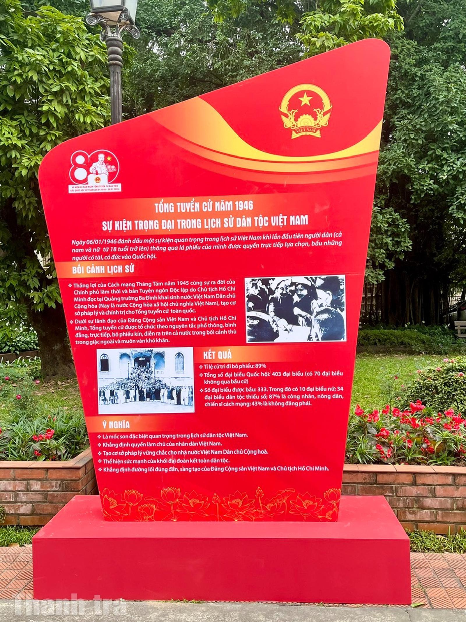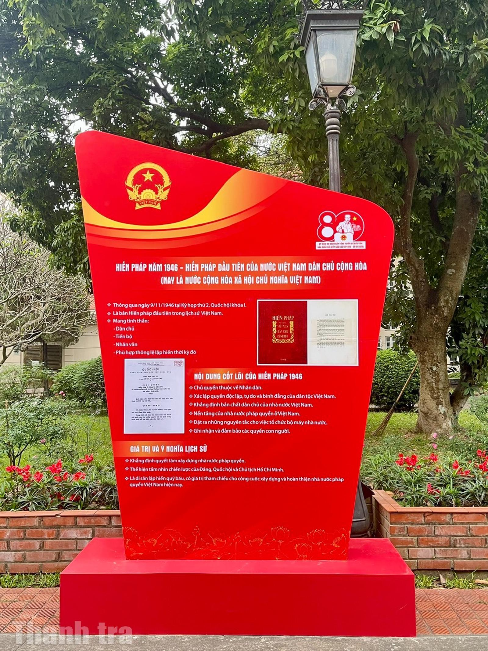 Triển lãm trưng bày 800 tài liệu gồm sách, báo, tạp chí, tranh, ảnh... được tổ chức theo 4 nội dung gắn liền với quá trình xây dựng và phát triển của Quốc hội Việt Nam. Đó là: Tổng tuyển cử năm 1946 - Sự kiện trọng đại trong lịch sử dân tộc Việt Nam; Quốc hội Việt Nam trong hành trình đấu tranh giành độc lập dân tộc và thống nhất đất nước; Quốc hội Việt Nam trong công cuộc đổi mới đất nước; Quốc hội Việt Nam - 80 năm đồng hành cùng dân tộc.
