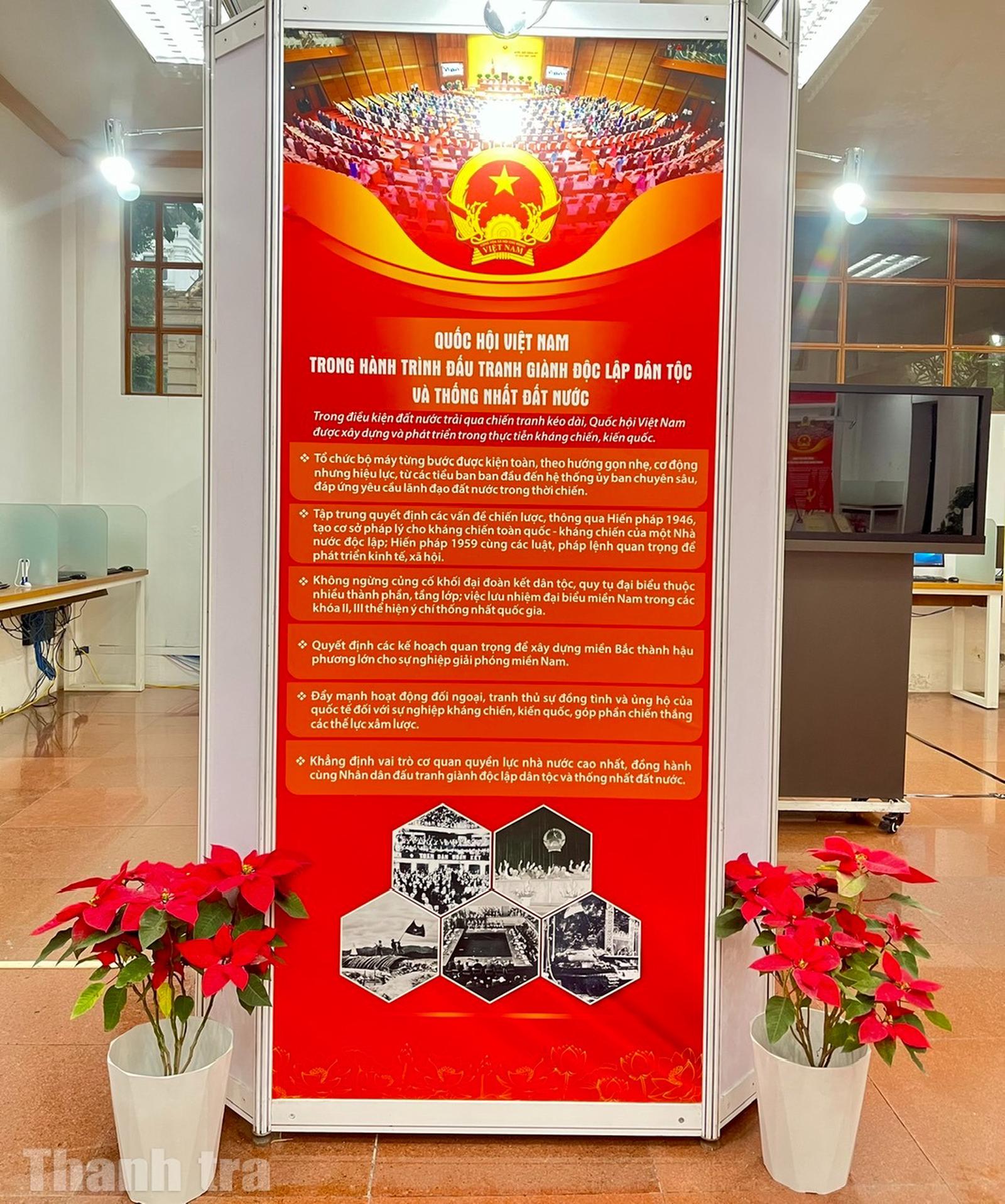 2. Quốc hội Việt Nam trong hành trình đấu tranh giành độc lập dân tộc và thống nhất đất nước: Trưng bày tư liệu viết về việc tổ chức và kiện toàn bộ máy của Quốc hội theo hướng gọn nhẹ, cơ động nhưng hiệu lực, đồng hành cùng Nhân dân đấu tranh giành độc lập dân tộc và thống nhất đất nước; vai trò của Quốc hội trong việc huy động sức mạnh toàn dân.