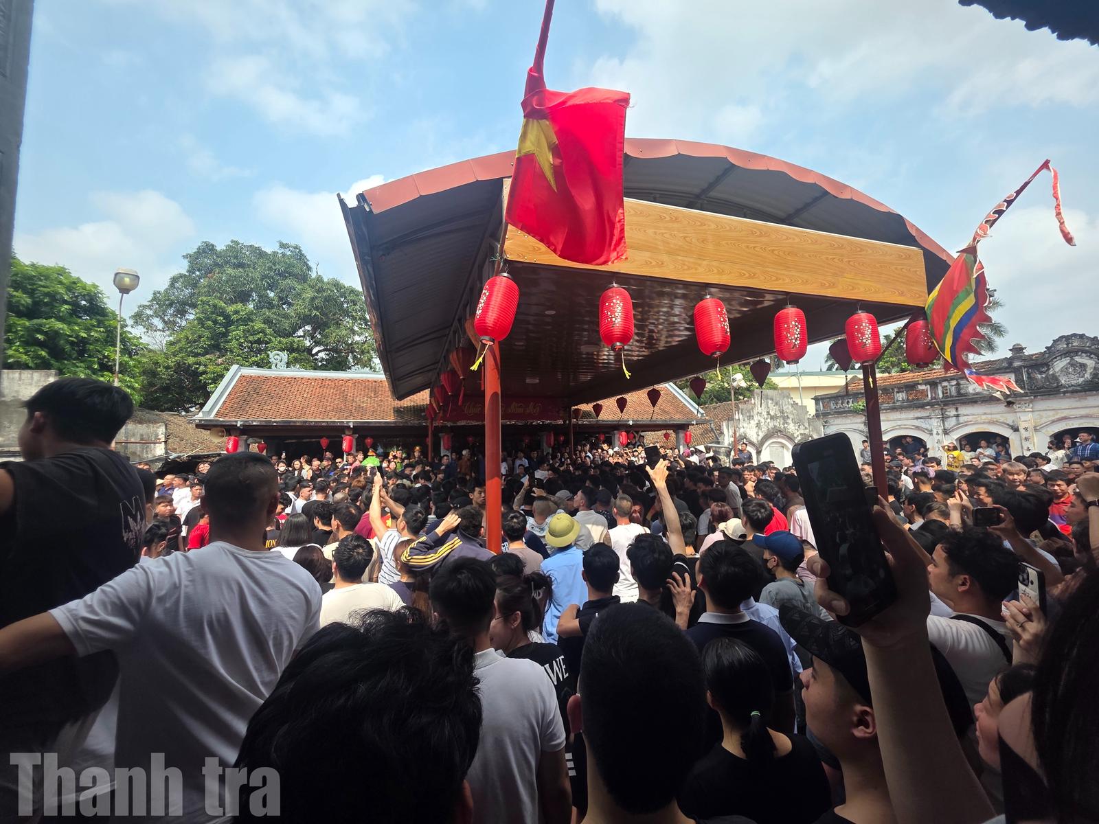 Hàng trăm thanh niên trai làng tham gia cuộc thi Giằng bông ở lễ hội. Ảnh: Bảo San